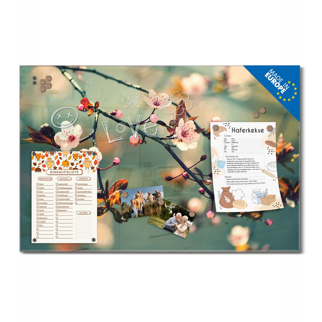 Material: 4mm Sicherheitsglas mit Metallrückwand Eigenschaften: beschreibbar, magnetisch, kratzfest Maße: 75x50x0,6cm, 5,63kg schwer Motiv Nummer 12761 Japankirsche Zubehör: inklusive 4 Neodym-Magnete