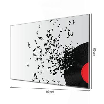 Material: 4mm Sicherheitsglas mit Metallrückwand Eigenschaften: beschreibbar, magnetisch, kratzfest Maße: 90x60x0,6cm, 8,10kg schwer Motiv Nummer 10730 Juke Box Zubehör: inklusive 4 Neodym-Magnete