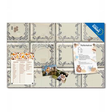 Material: 4mm Sicherheitsglas mit Metallrückwand Eigenschaften: beschreibbar, magnetisch, kratzfest Maße: 75x50x0,6cm, 5,63kg schwer Motiv Nummer 10413 Kacheln Zubehör: inklusive 4 Neodym-Magnete