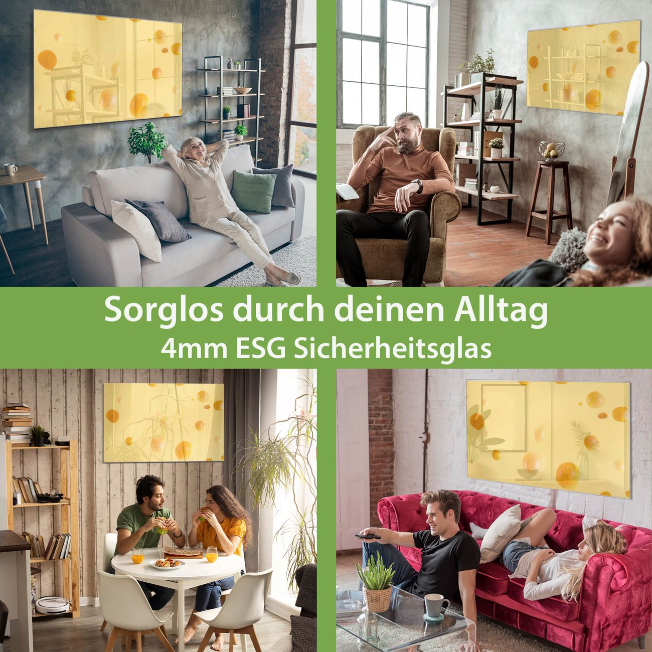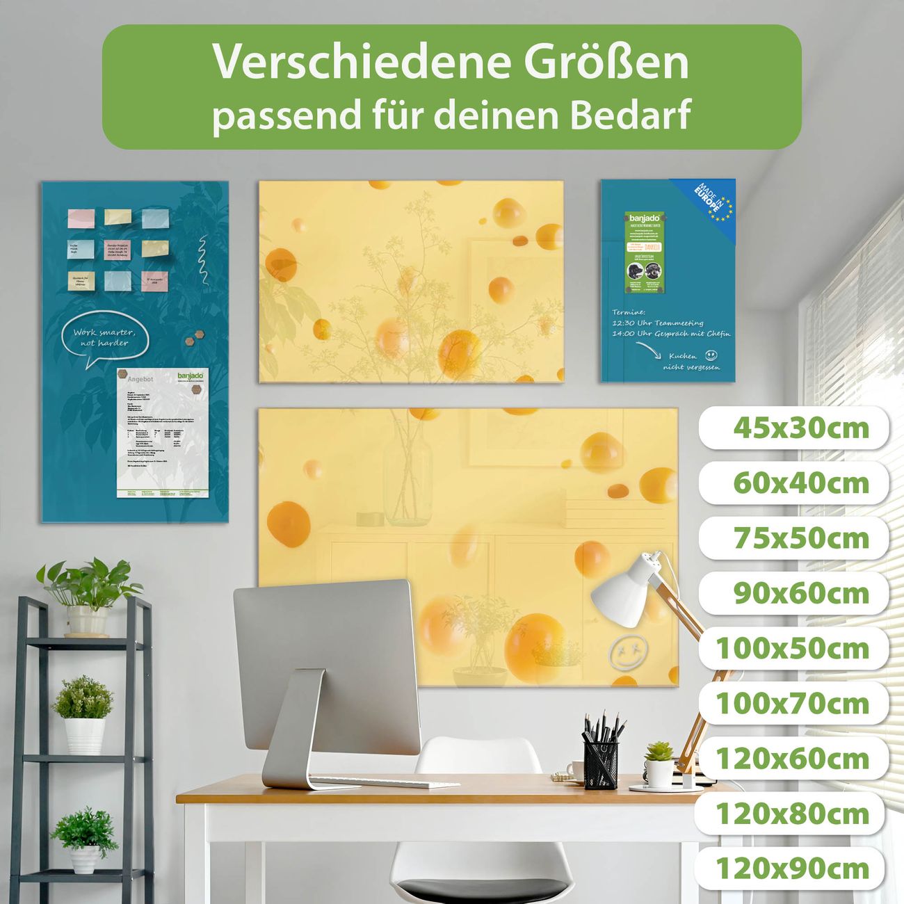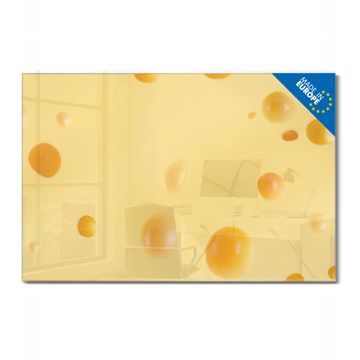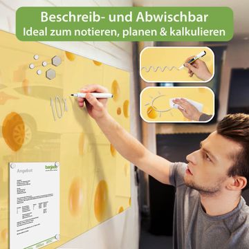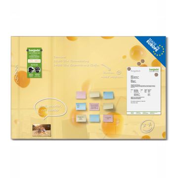 Material: 4mm Sicherheitsglas mit Metallrückwand Eigenschaften: beschreibbar, magnetisch, kratzfest Maße: 120x80x0,6cm, 14,40kg schwer Motiv Nummer 10263 Käse Zubehör: inklusive 4 Neodym-Magnete