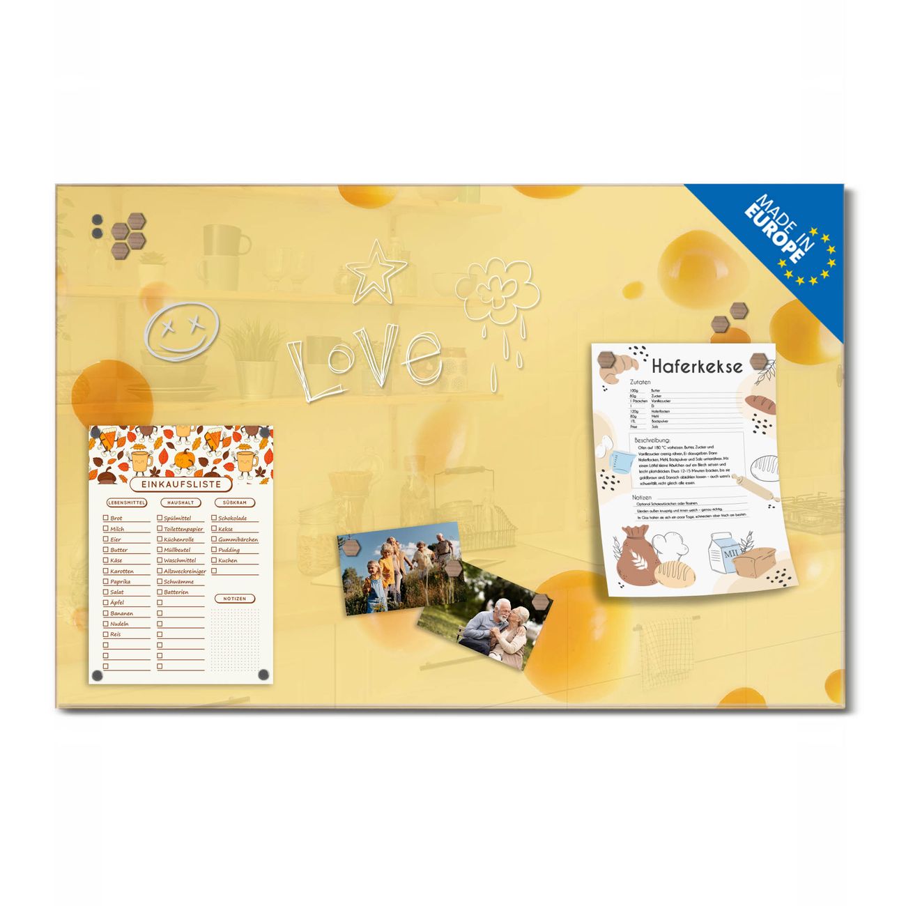 Material: 4mm Sicherheitsglas mit Metallrückwand Eigenschaften: beschreibbar, magnetisch, kratzfest Maße: 75x50x0,6cm, 5,63kg schwer Motiv Nummer 10263 Käse Zubehör: inklusive 4 Neodym-Magnete