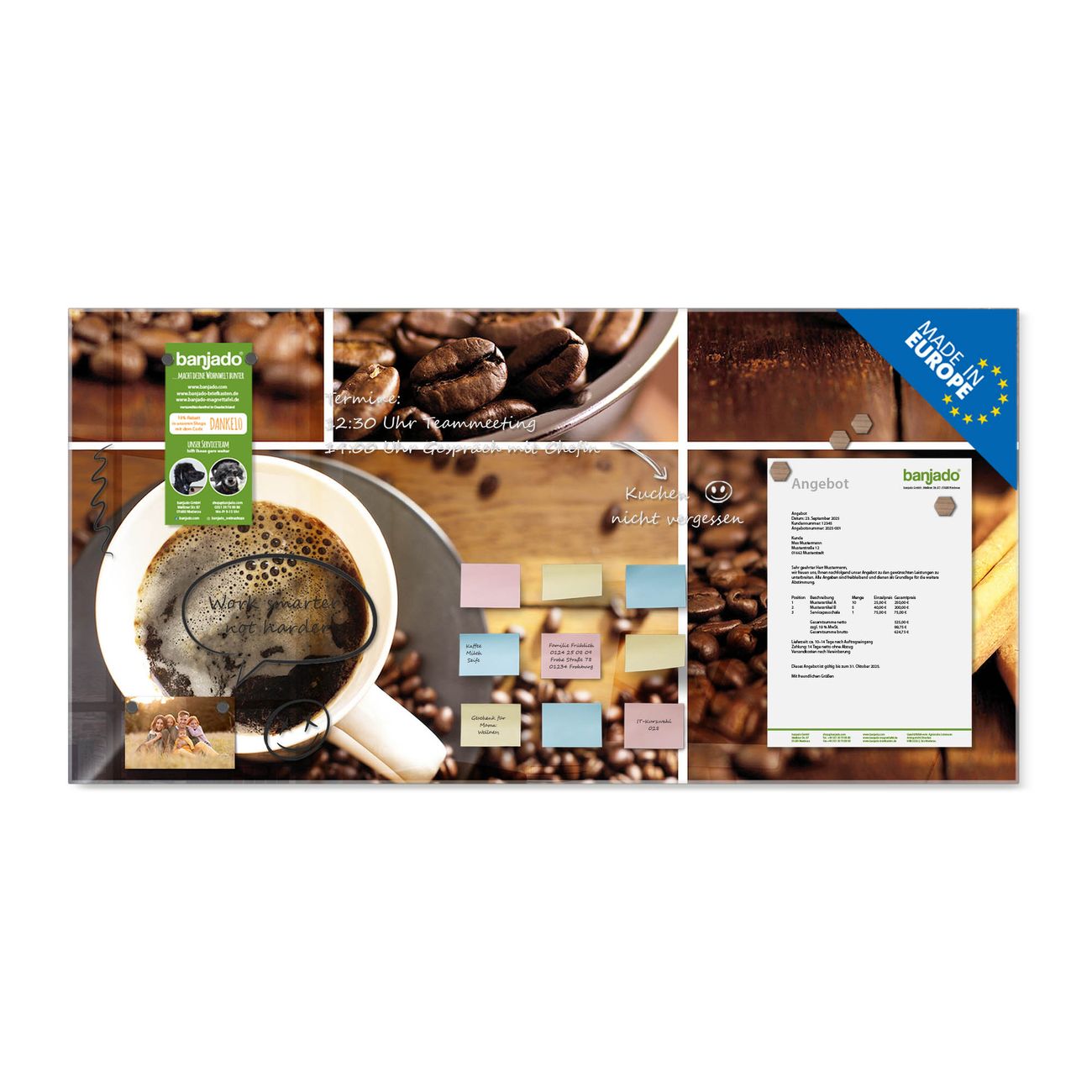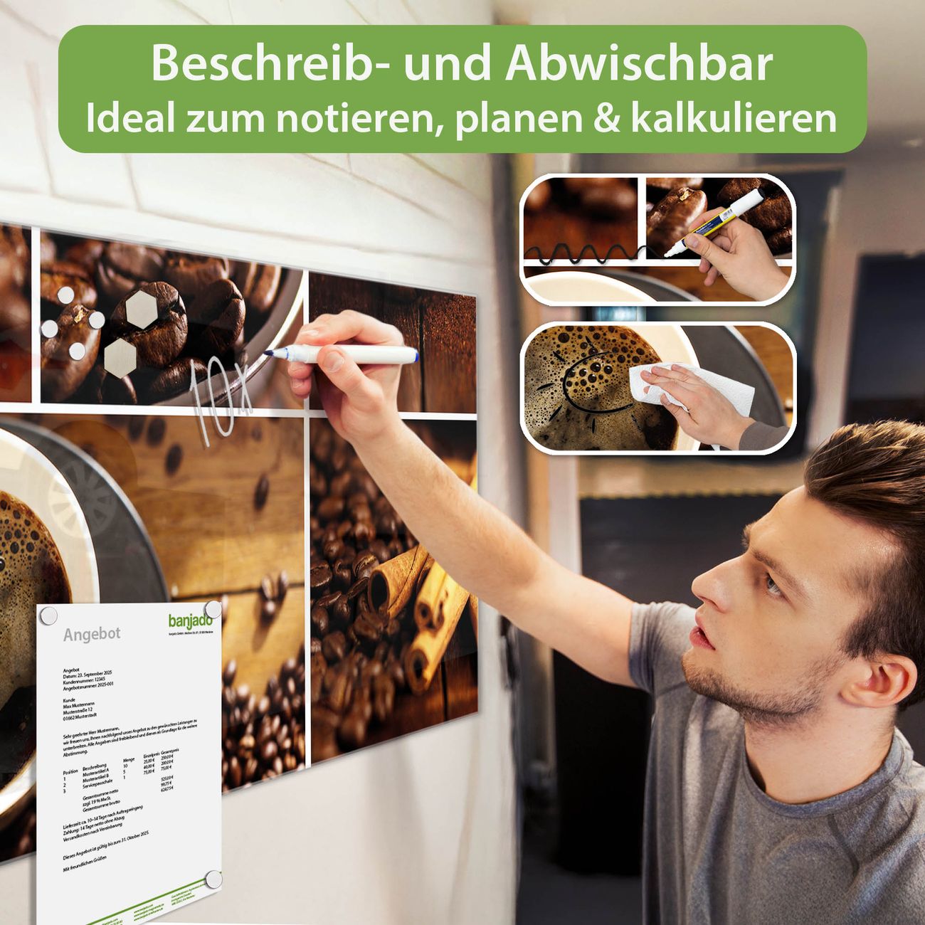 Material: 4mm Sicherheitsglas mit Metallrückwand Eigenschaften: beschreibbar, magnetisch, kratzfest Maße: 100x50x0,6cm, 7,50kg schwer Motiv Nummer 10014 Kaffee&Schokolade Zubehör: inklusive 4 Neodym-Magnete