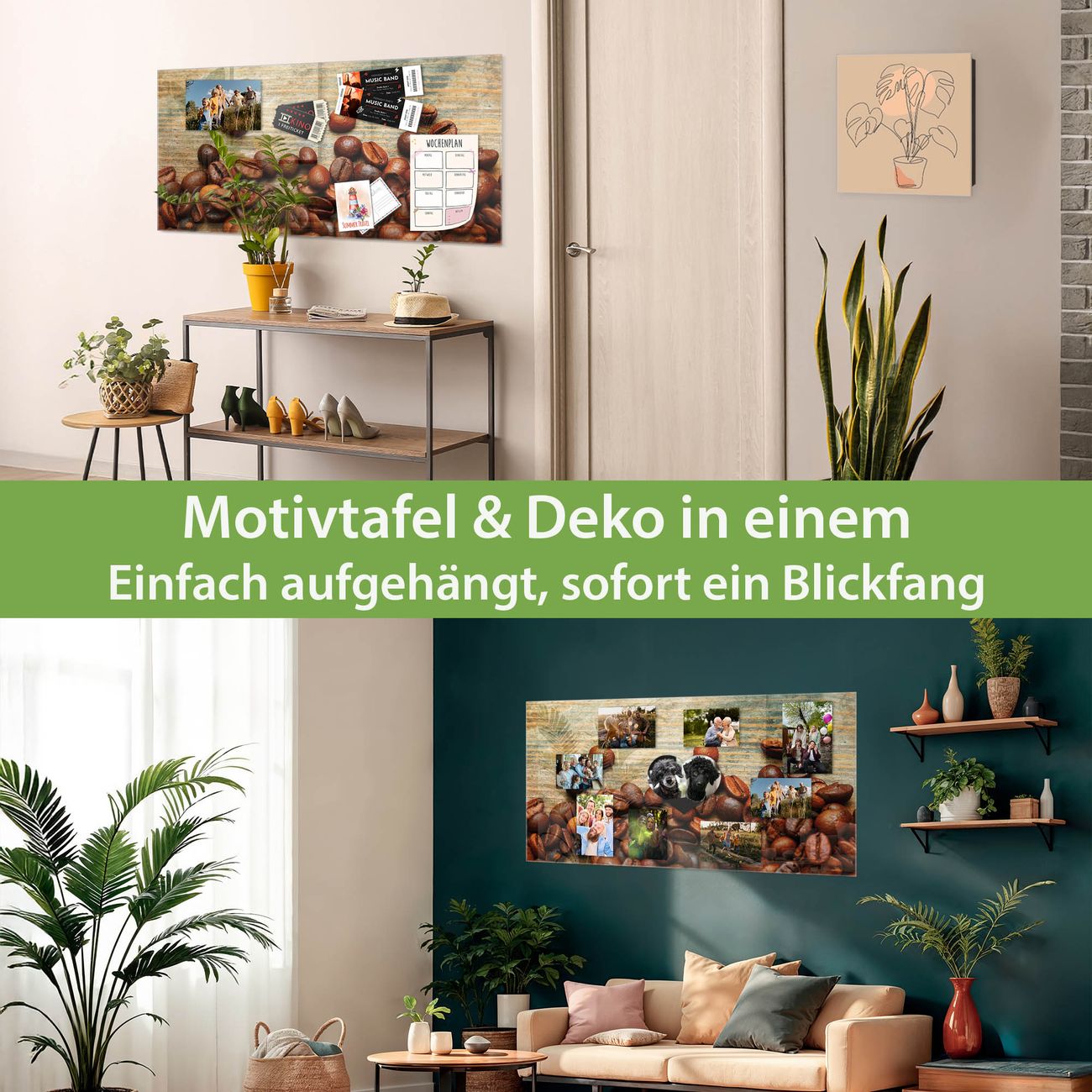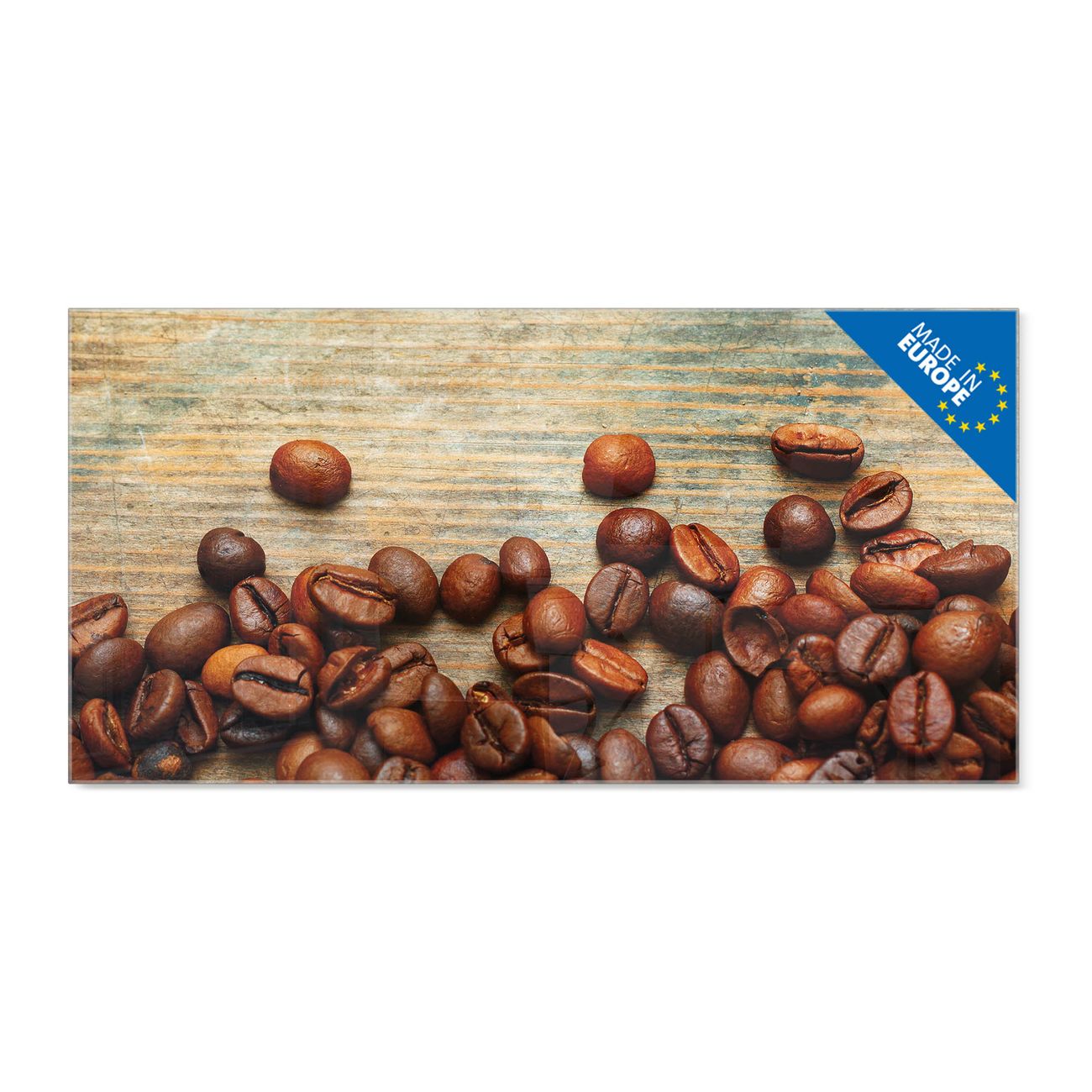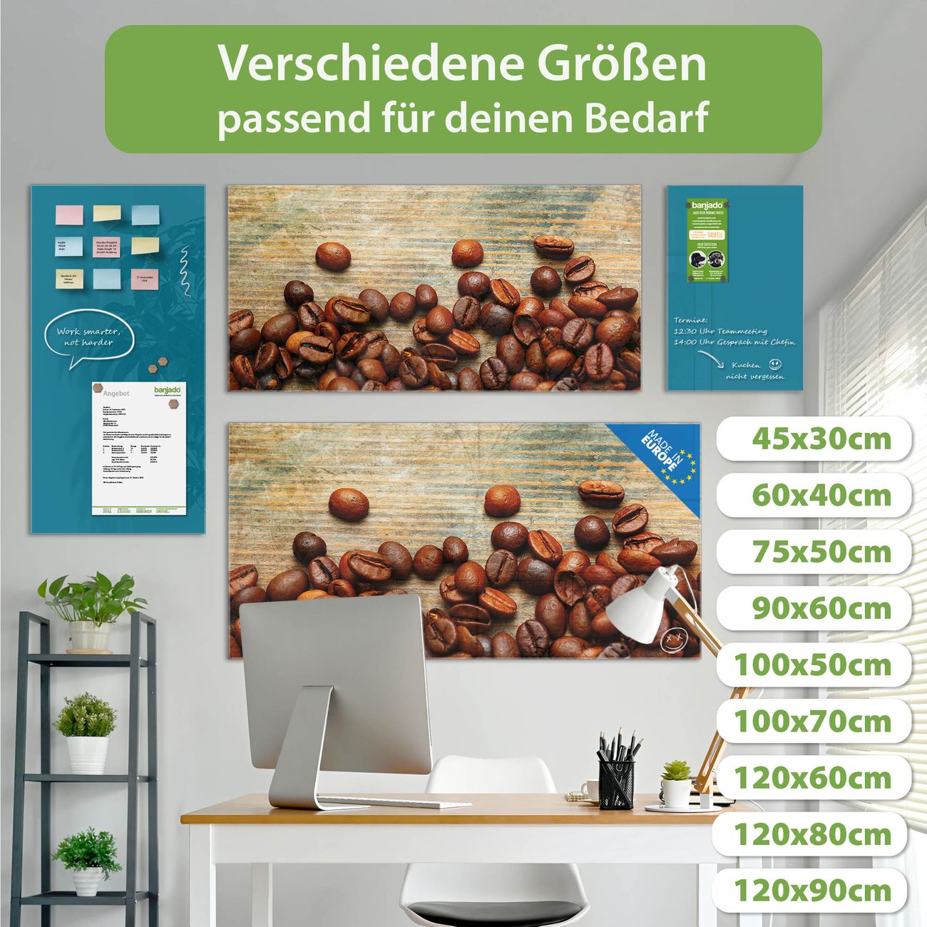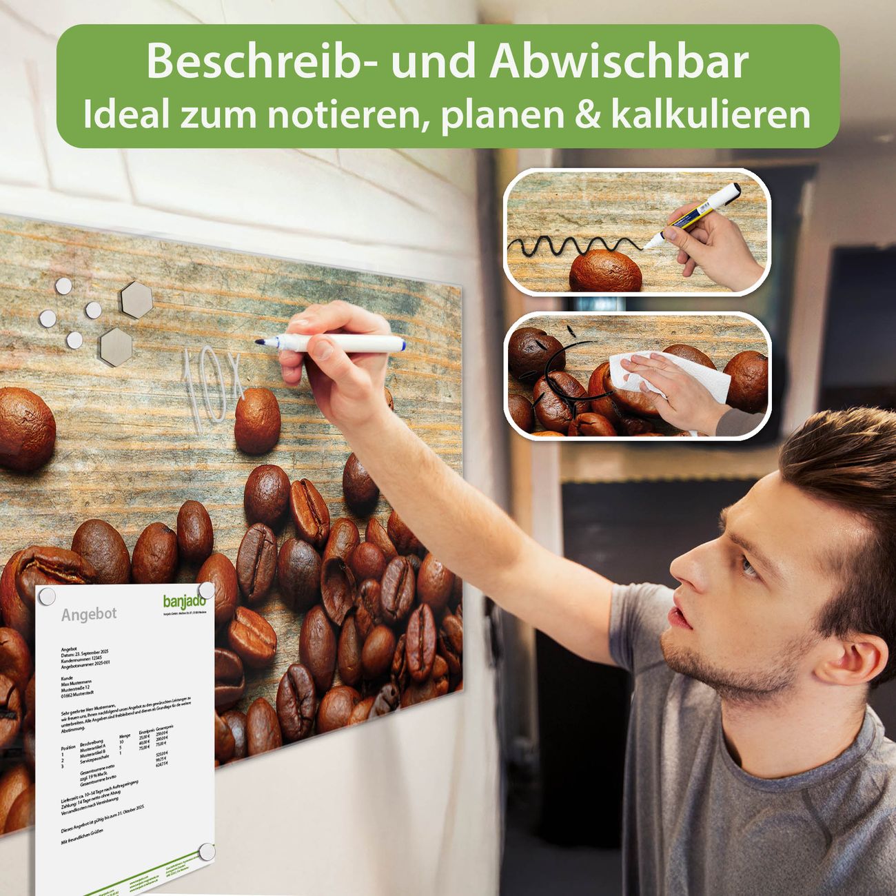 Material: 4mm Sicherheitsglas mit Metallrückwand Eigenschaften: beschreibbar, magnetisch, kratzfest Maße: 100x50x0,6cm, 7,50kg schwer Motiv Nummer 11698 Kaffeebohnen Zubehör: inklusive 4 Neodym-Magnete