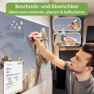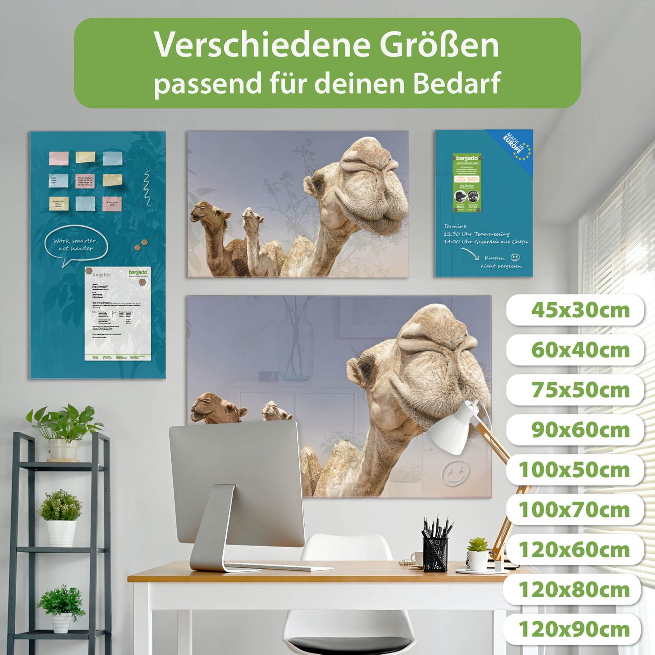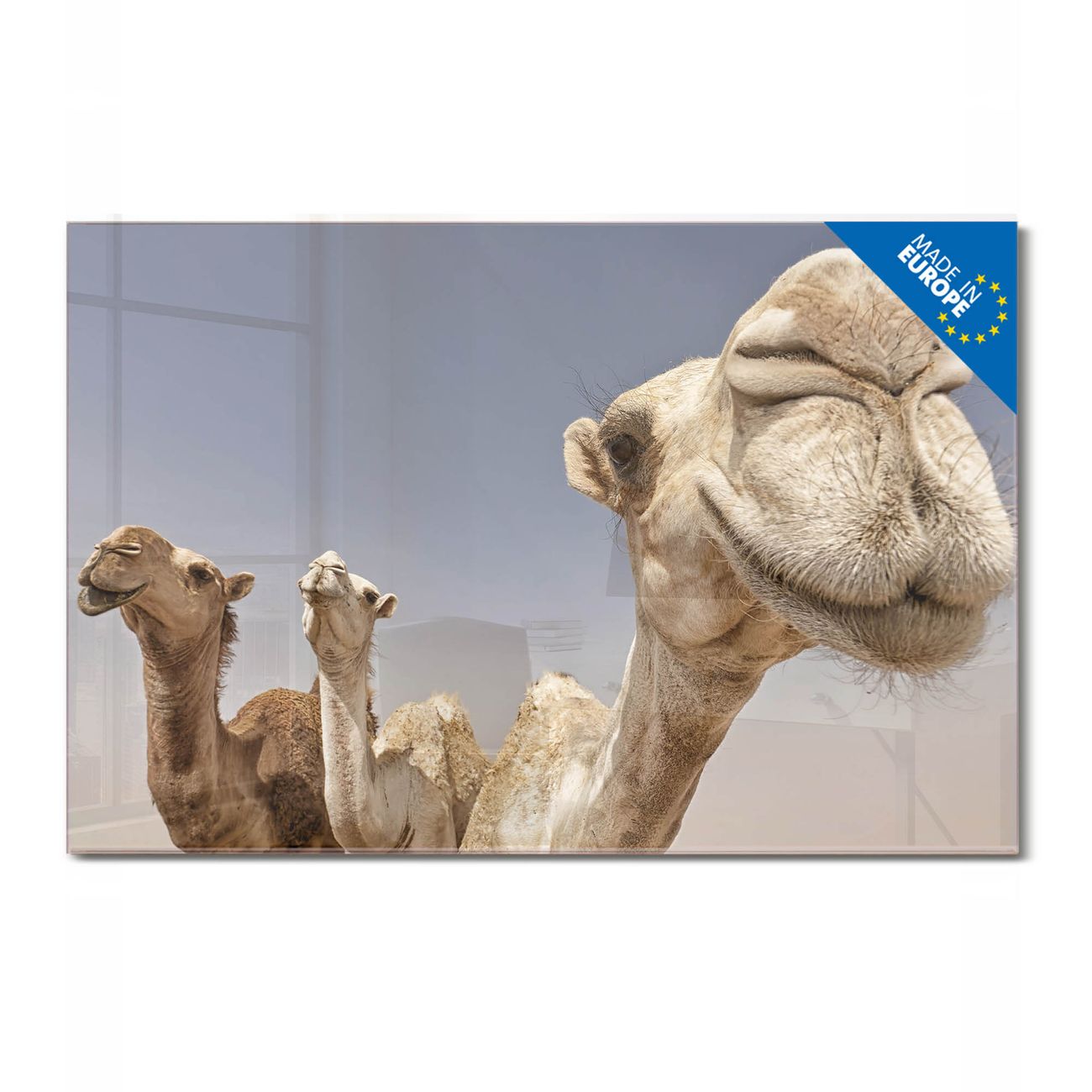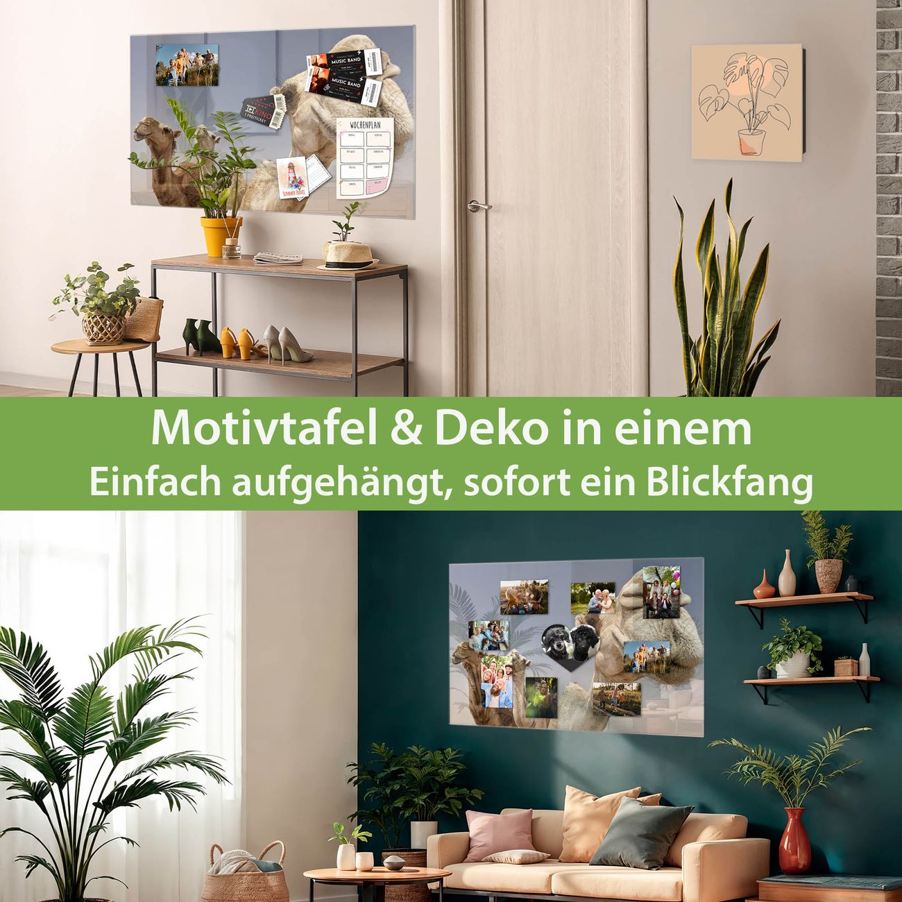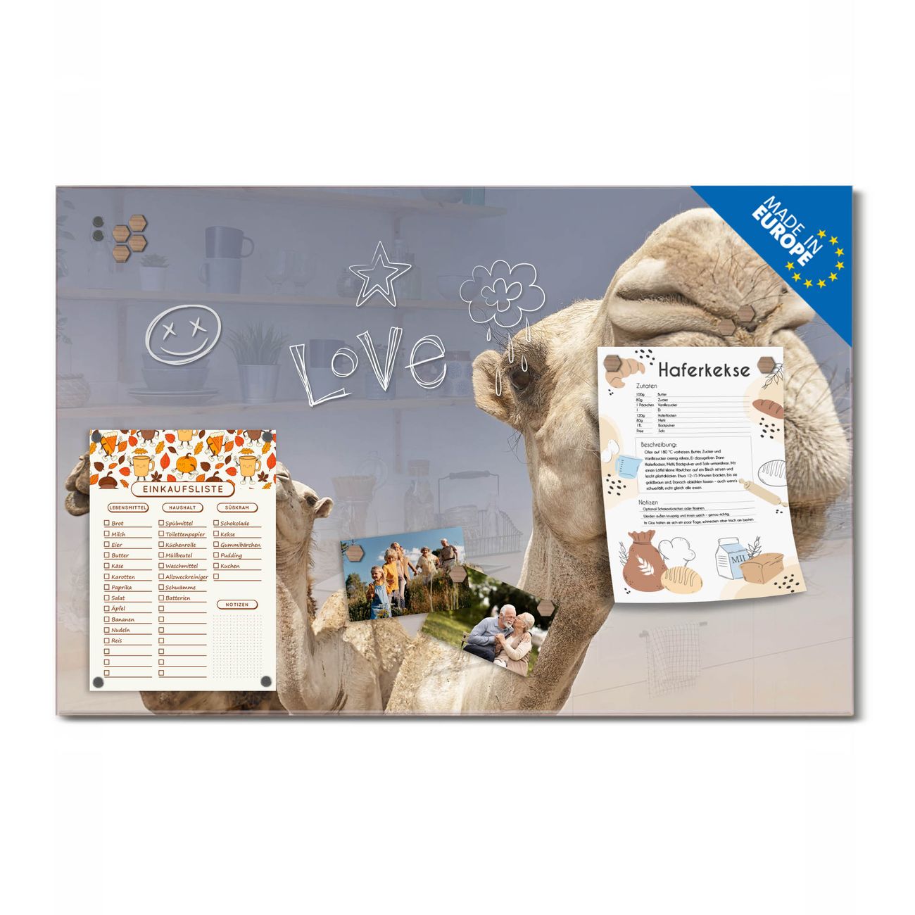 Material: 4mm Sicherheitsglas mit Metallrückwand Eigenschaften: beschreibbar, magnetisch, kratzfest Maße: 75x50x0,6cm, 5,63kg schwer Motiv Nummer 10303 Kamele Zubehör: inklusive 4 Neodym-Magnete