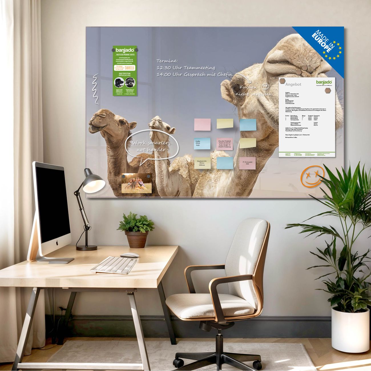 Die banjado Glas Magnettafel mit dem Motiv Motiv Kamele verbindet Funktionalität mit Stil. Sie ersetzt das Zettelchaos durch klare Strukturen und bringt dabei eine warme, natürliche Atmosphäre in Ihr Zuhause. Ob im Büro, in der Küche oder im Eingangsbereich - dieses Design-Board zieht Blicke an und sorgt für Ordnung mit Charakter.