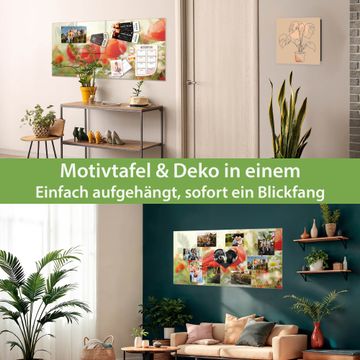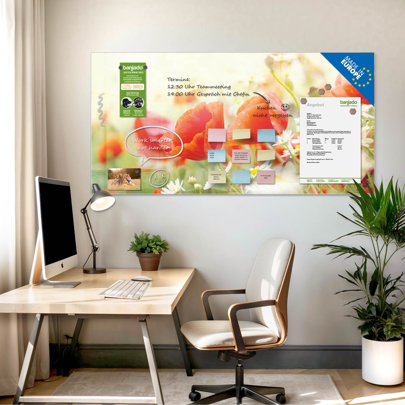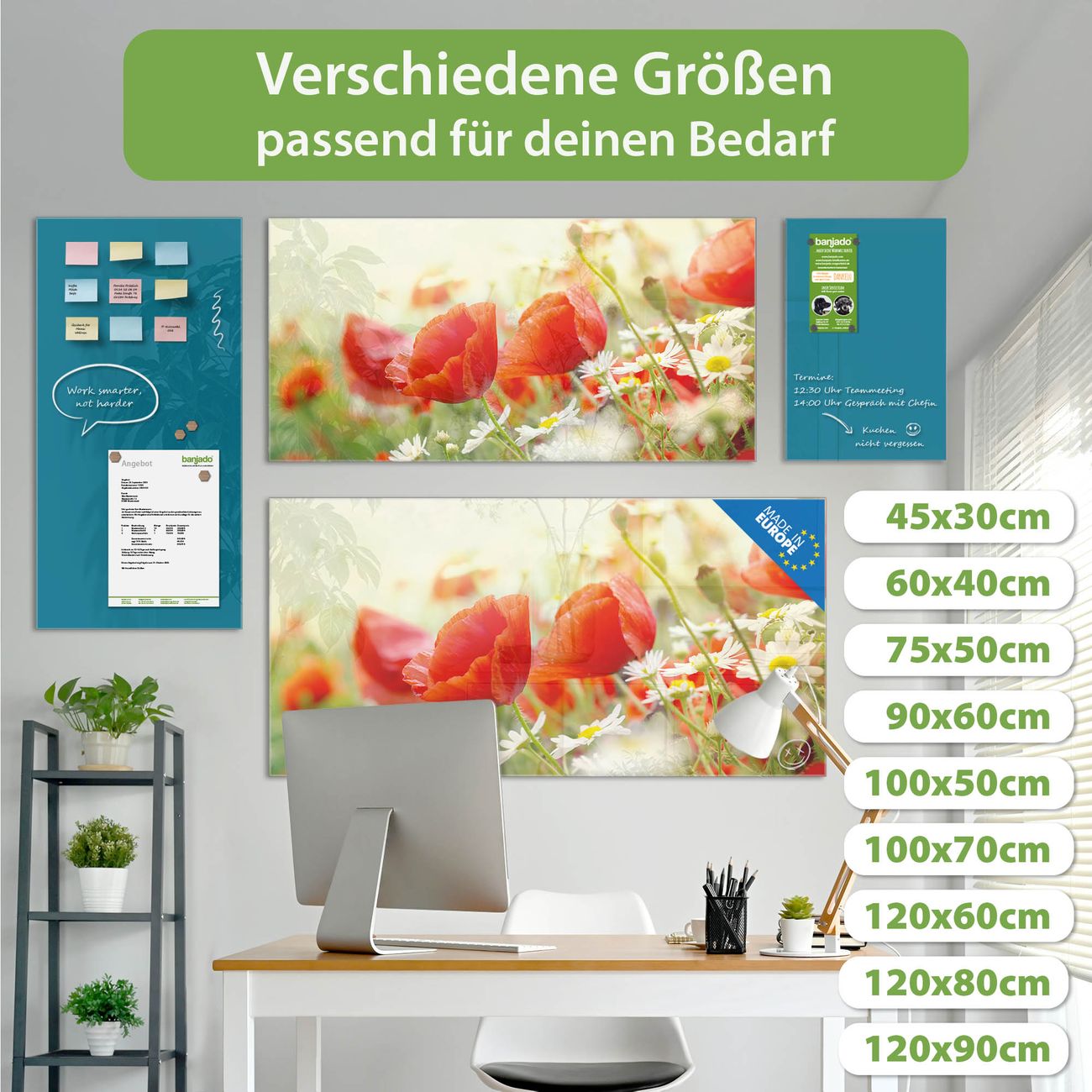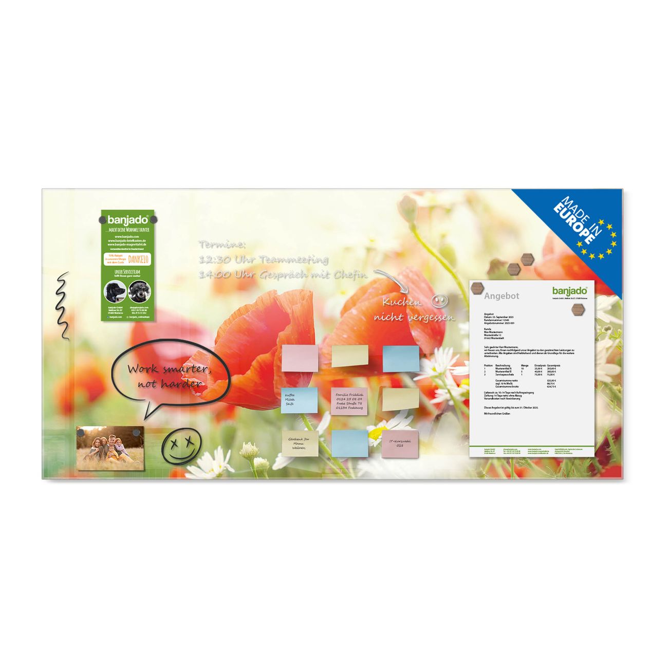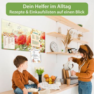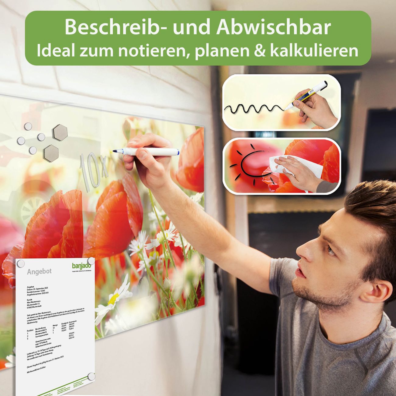 Material: 4mm Sicherheitsglas mit Metallrückwand Eigenschaften: beschreibbar, magnetisch, kratzfest Maße: 110x55x0,6cm, 9,08kg schwer Motiv Nummer 12294 Kamille Und Mohn Zubehör: inklusive 4 Neodym-Magnete