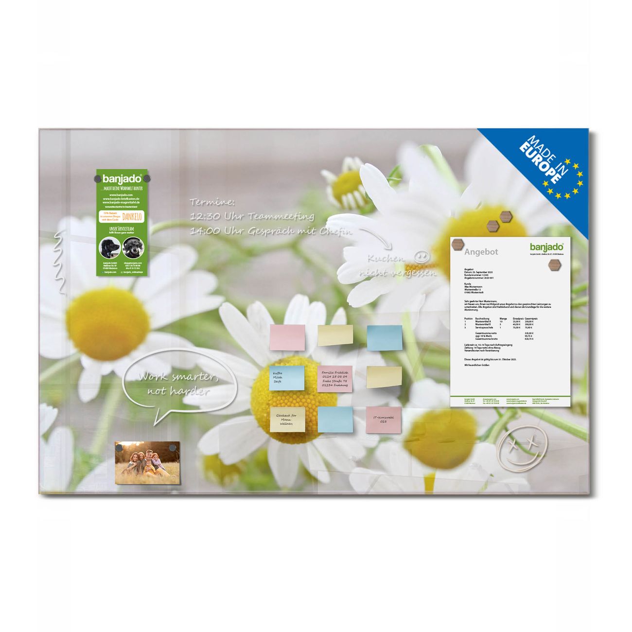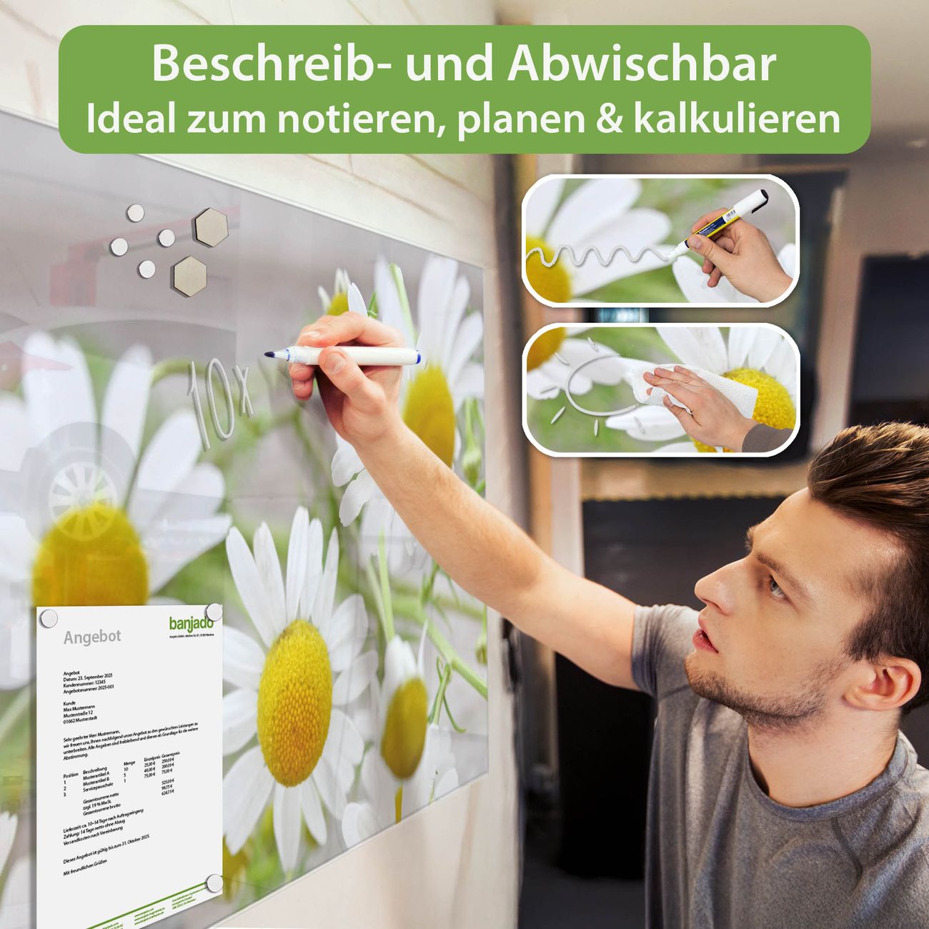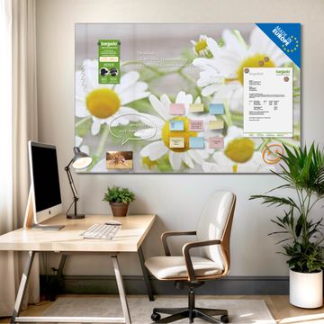 Material: 4mm Sicherheitsglas mit Metallrückwand Eigenschaften: beschreibbar, magnetisch, kratzfest Maße: 120x80x0,6cm, 14,40kg schwer Motiv Nummer 11261 Kamillenblüten Zubehör: inklusive 4 Neodym-Magnete