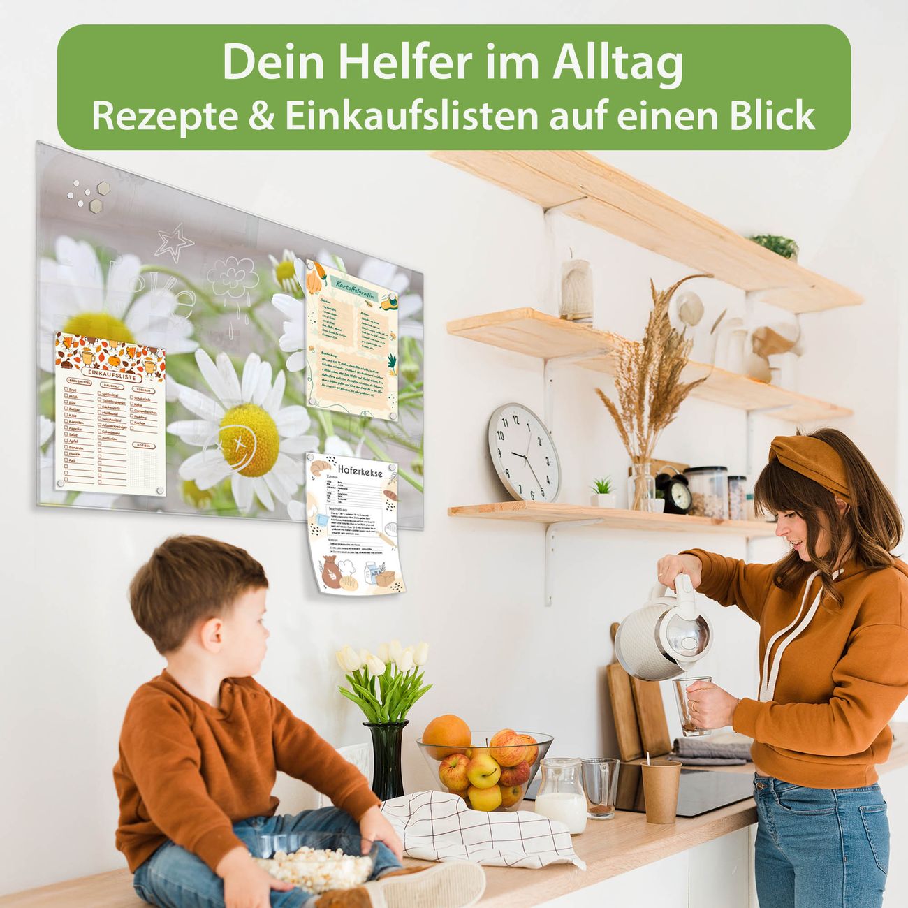 Ein Stück Design, das Ihren Alltag organisiert. Schreiben, heften, inspirieren - alles an einem Ort. Qualität, die man spürt. Montage leicht gemacht. Handwerk mit Herz - veredelt in Sachsen. Einzigartiges Design mit Motiv Motiv Kamillenblüten Beschreibbare Glasoberfläche, leicht zu reinigen Starke Magnetkraft durch Stahlrückwand Inklusive 4 Neodym-Magneten Flexible Montageoptionen Handveredelt in Sachsen - Qualität, die bleibt