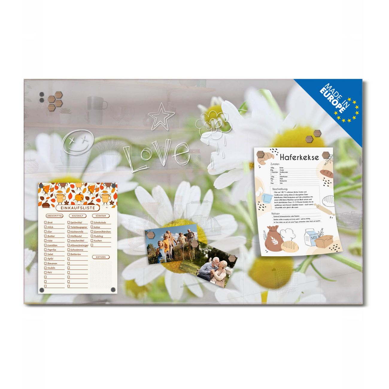Material: 4mm Sicherheitsglas mit Metallrückwand Eigenschaften: beschreibbar, magnetisch, kratzfest Maße: 75x50x0,6cm, 5,63kg schwer Motiv Nummer 11261 Kamillenblüten Zubehör: inklusive 4 Neodym-Magnete