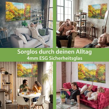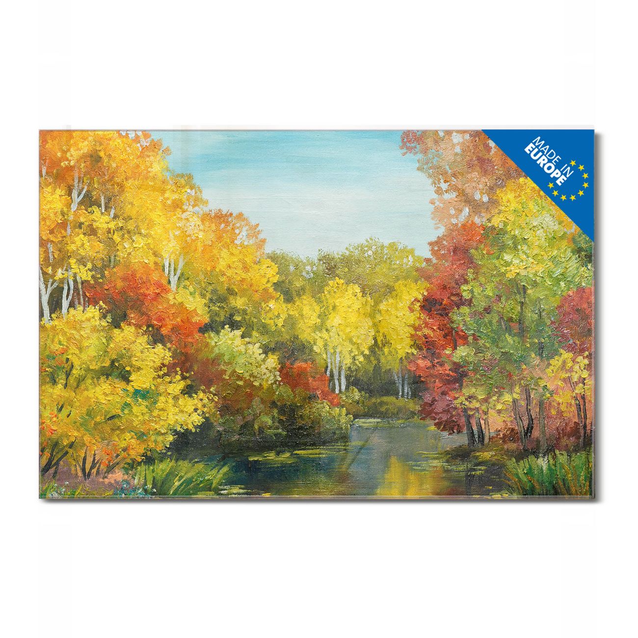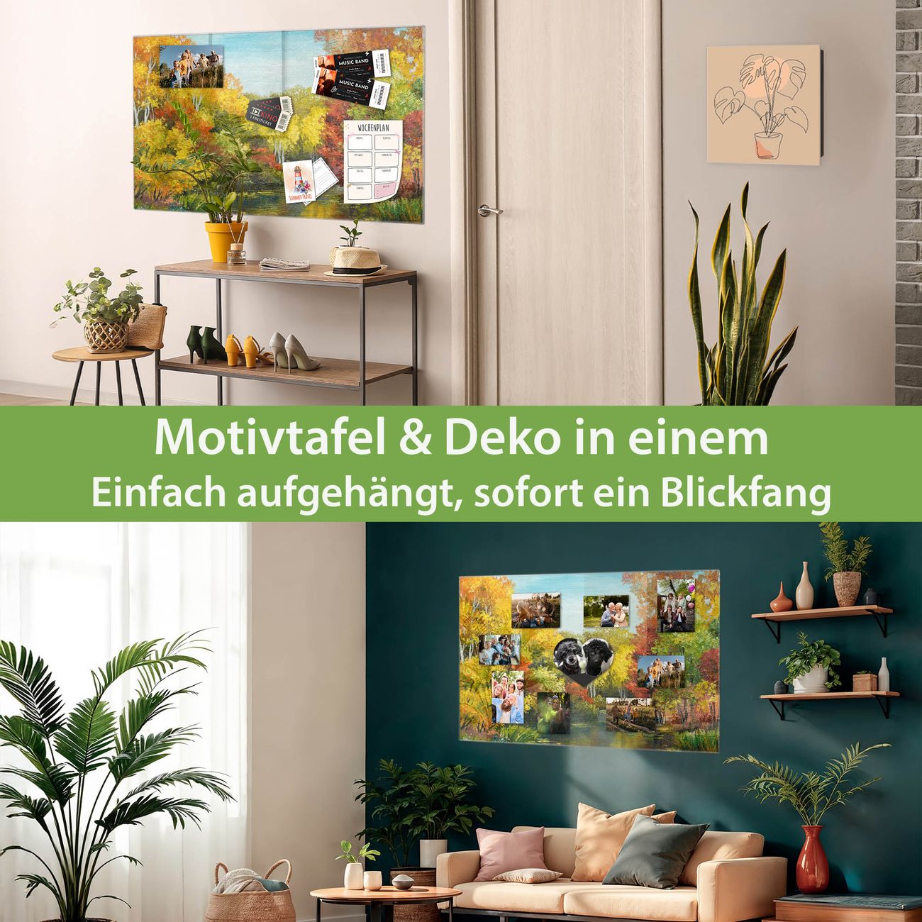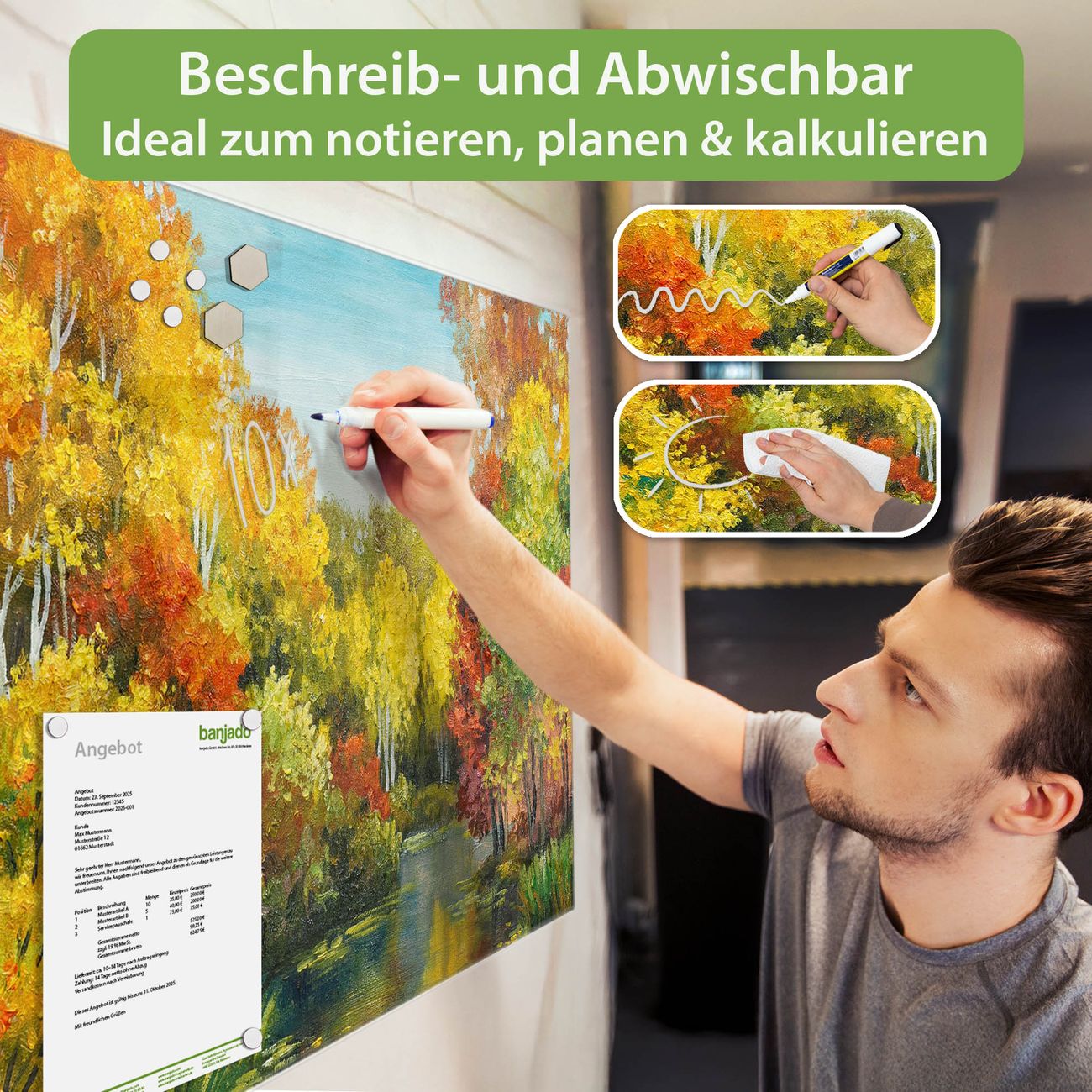 Material: 4mm Sicherheitsglas mit Metallrückwand Eigenschaften: beschreibbar, magnetisch, kratzfest Maße: 120x80x0,6cm, 14,40kg schwer Motiv Nummer 12354 Kanal Im Herbst Zubehör: inklusive 4 Neodym-Magnete