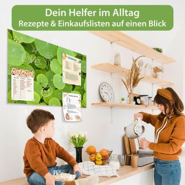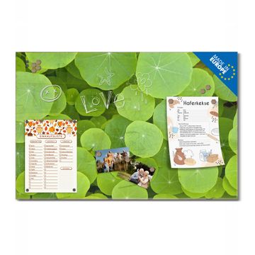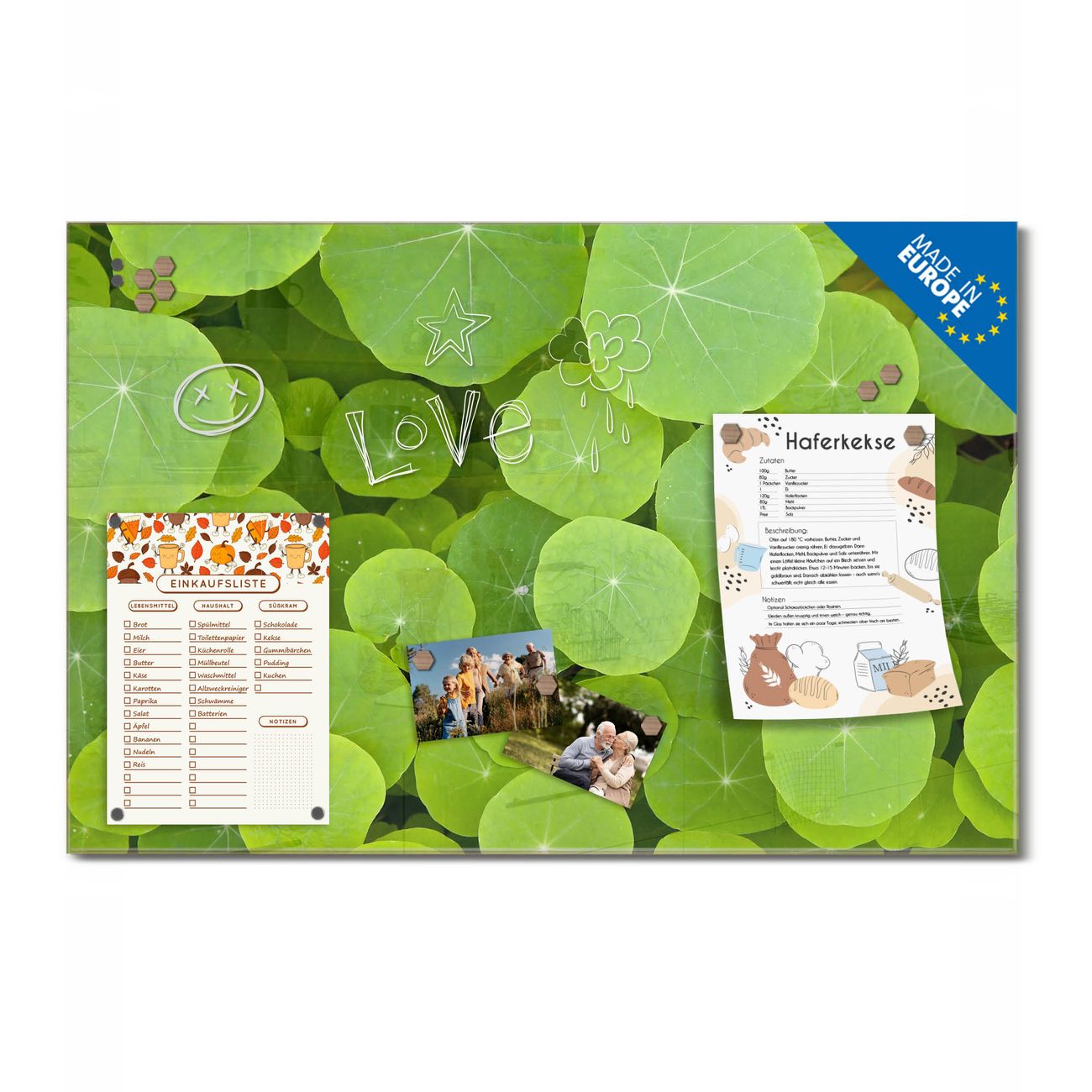 Material: 4mm Sicherheitsglas mit Metallrückwand Eigenschaften: beschreibbar, magnetisch, kratzfest Maße: 45x30x0,6cm, 2,03kg schwer Motiv Nummer 12300 Kapuzinerkresse Zubehör: inklusive 4 Neodym-Magnete