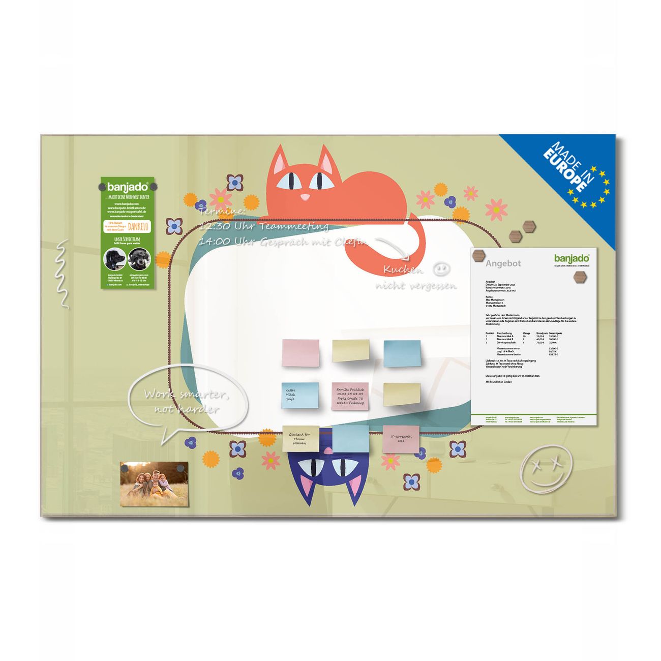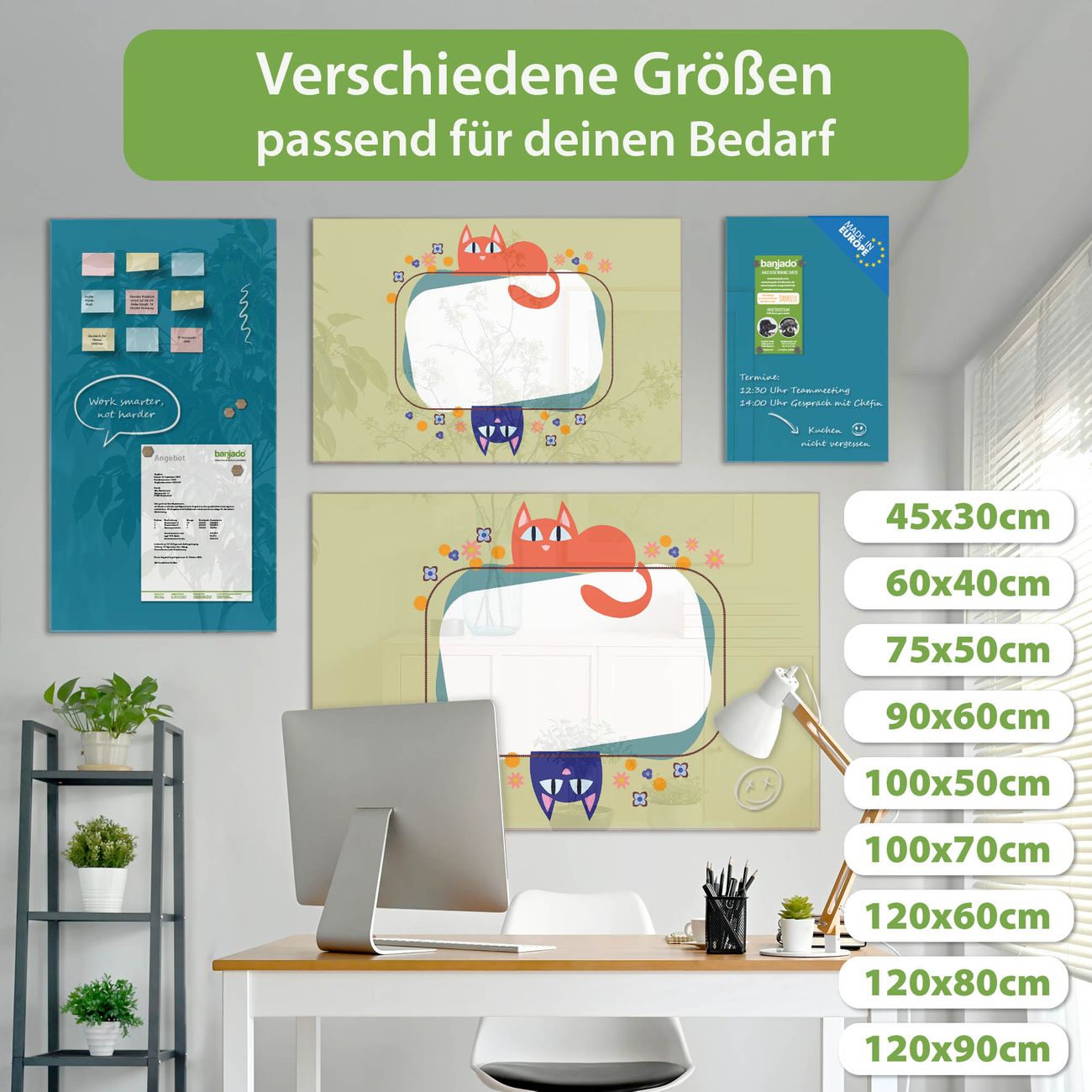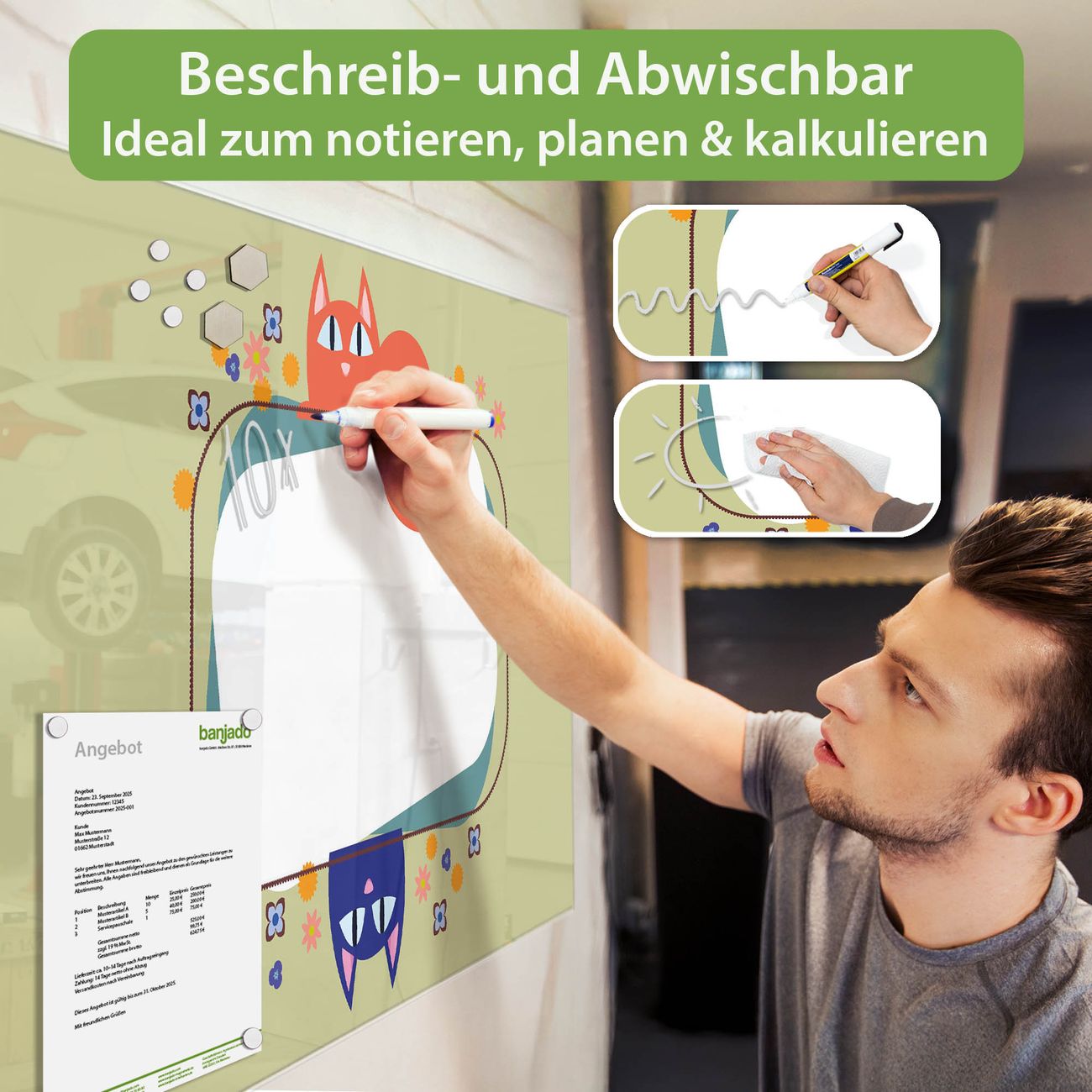 Jede Glas Magnettafel wird in unserer Werkstatt von Hand gefertigt und sorgfältig geprüft. So erhalten Sie ein echtes Qualitätsprodukt, das Funktion und Ästhetik perfekt vereint.?? Warum banjado?