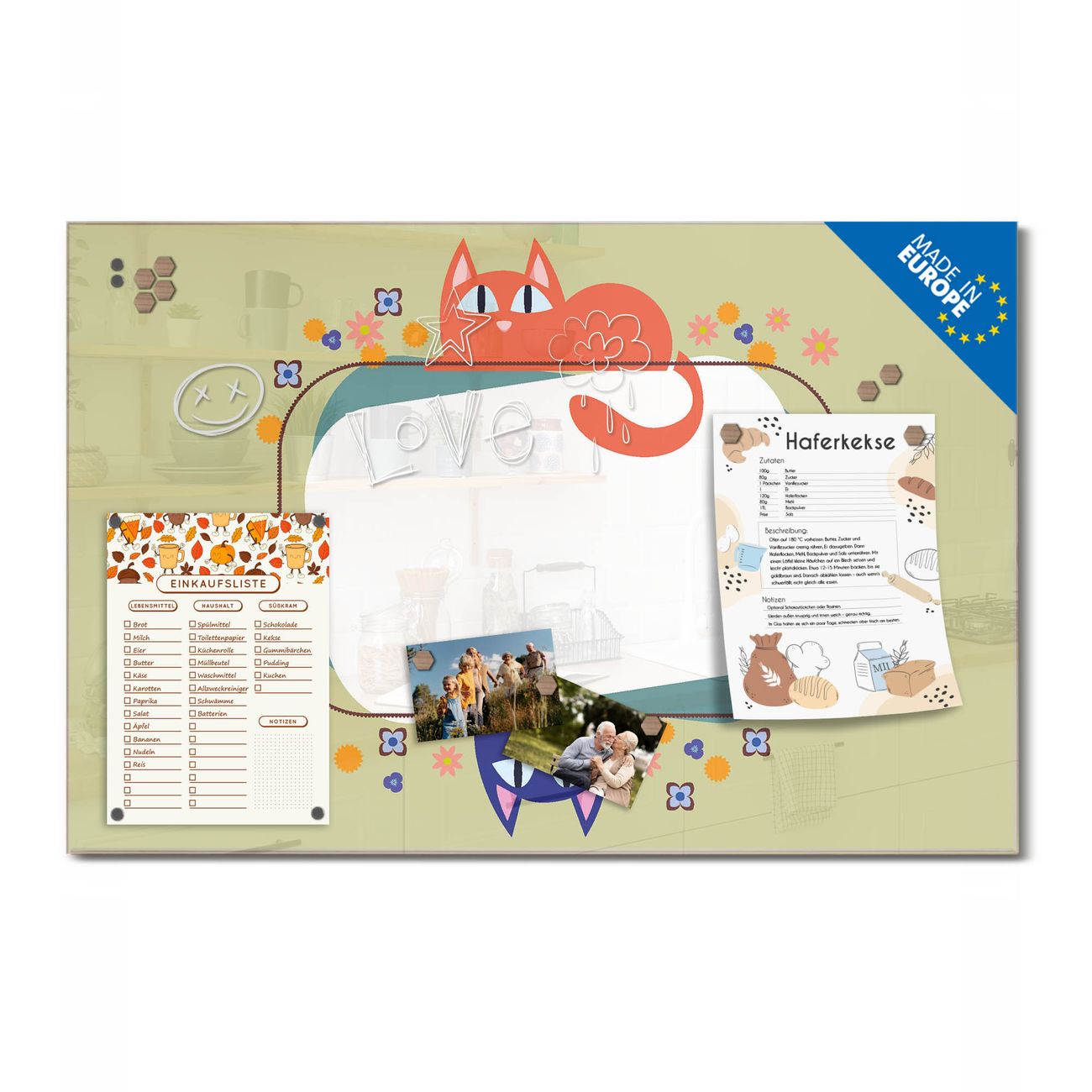 Ein Stück Design, das Ihren Alltag organisiert. Schreiben, heften, inspirieren - alles an einem Ort. Qualität, die man spürt. Montage leicht gemacht. Handwerk mit Herz - veredelt in Sachsen. Einzigartiges Design mit Motiv Motiv Karikatur Katzen Beschreibbare Glasoberfläche, leicht zu reinigen Starke Magnetkraft durch Stahlrückwand Inklusive 4 Neodym-Magneten Flexible Montageoptionen Handveredelt in Sachsen - Qualität, die bleibt