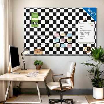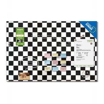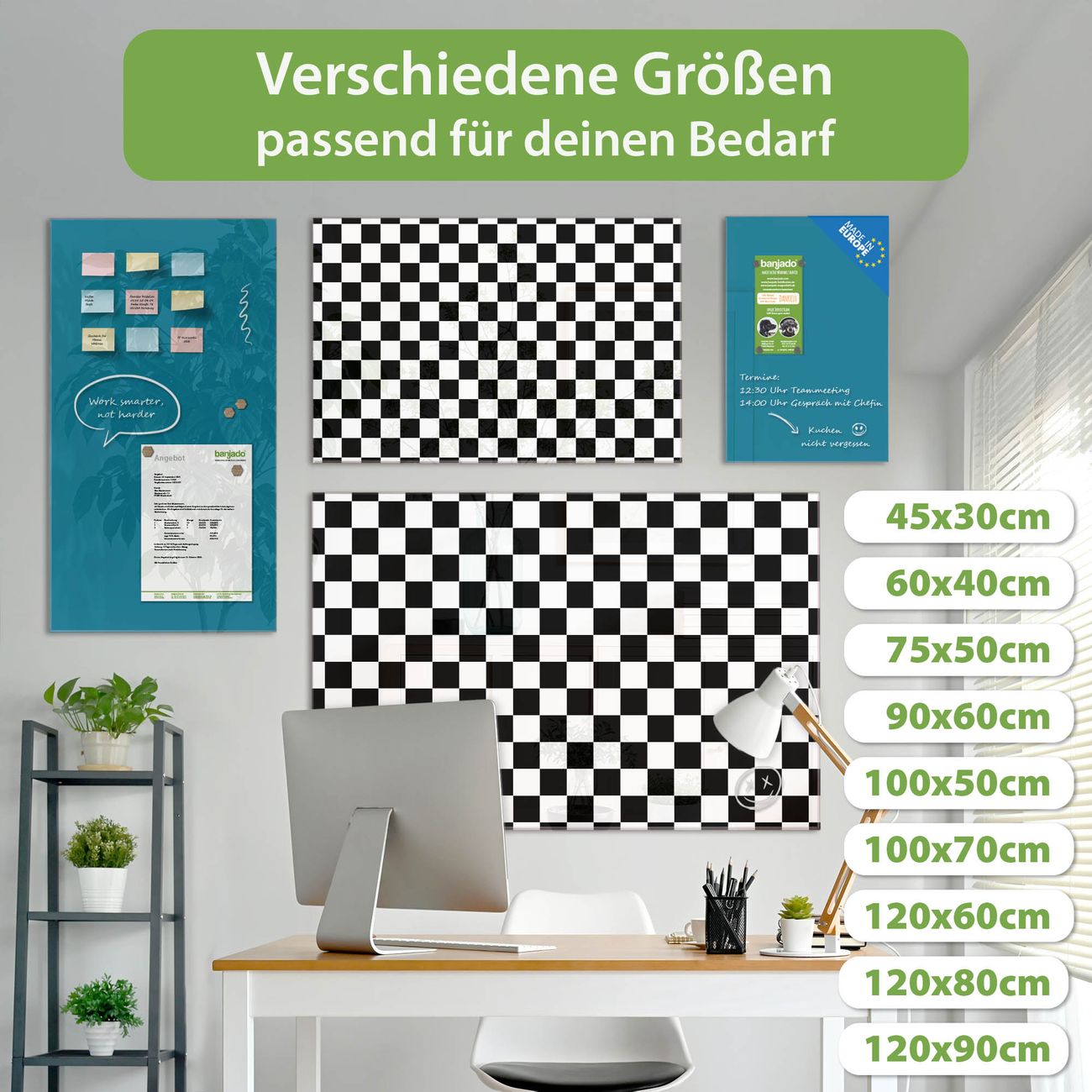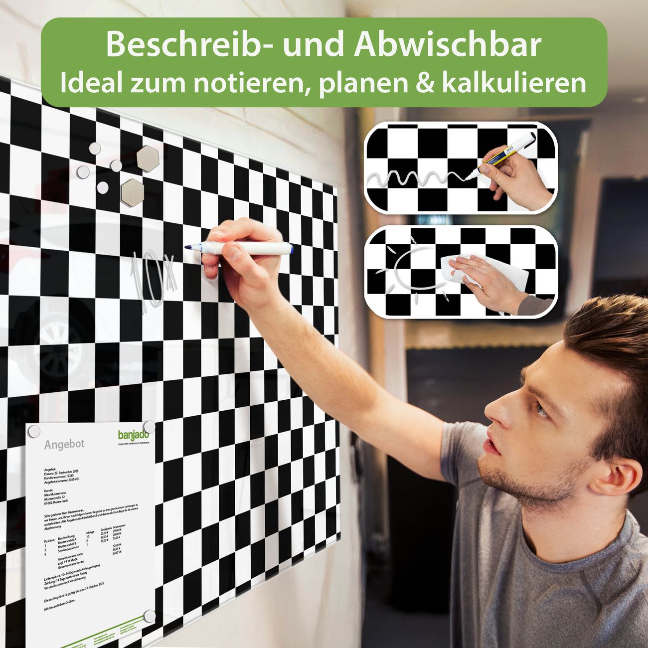 Material: 4mm Sicherheitsglas mit Metallrückwand Eigenschaften: beschreibbar, magnetisch, kratzfest Maße: 120x80x0,6cm, 14,40kg schwer Motiv Nummer 10608 Karo Schwarz Zubehör: inklusive 4 Neodym-Magnete