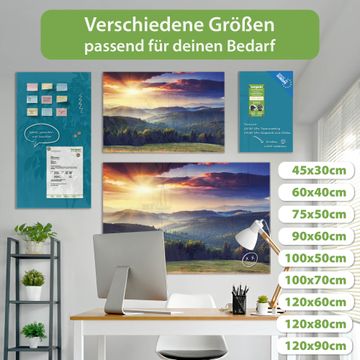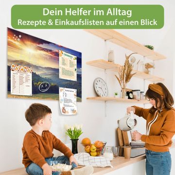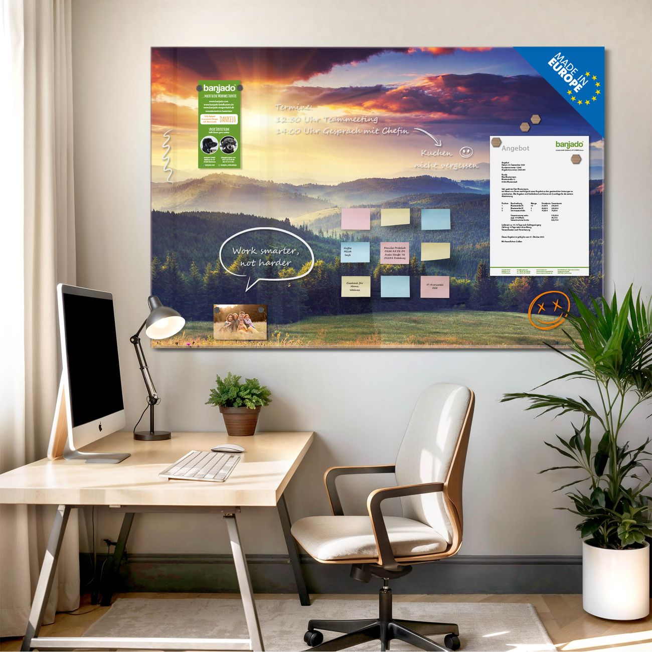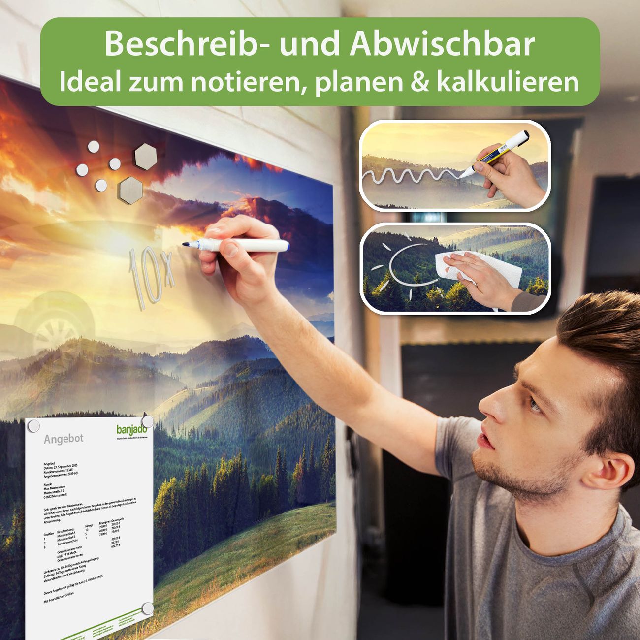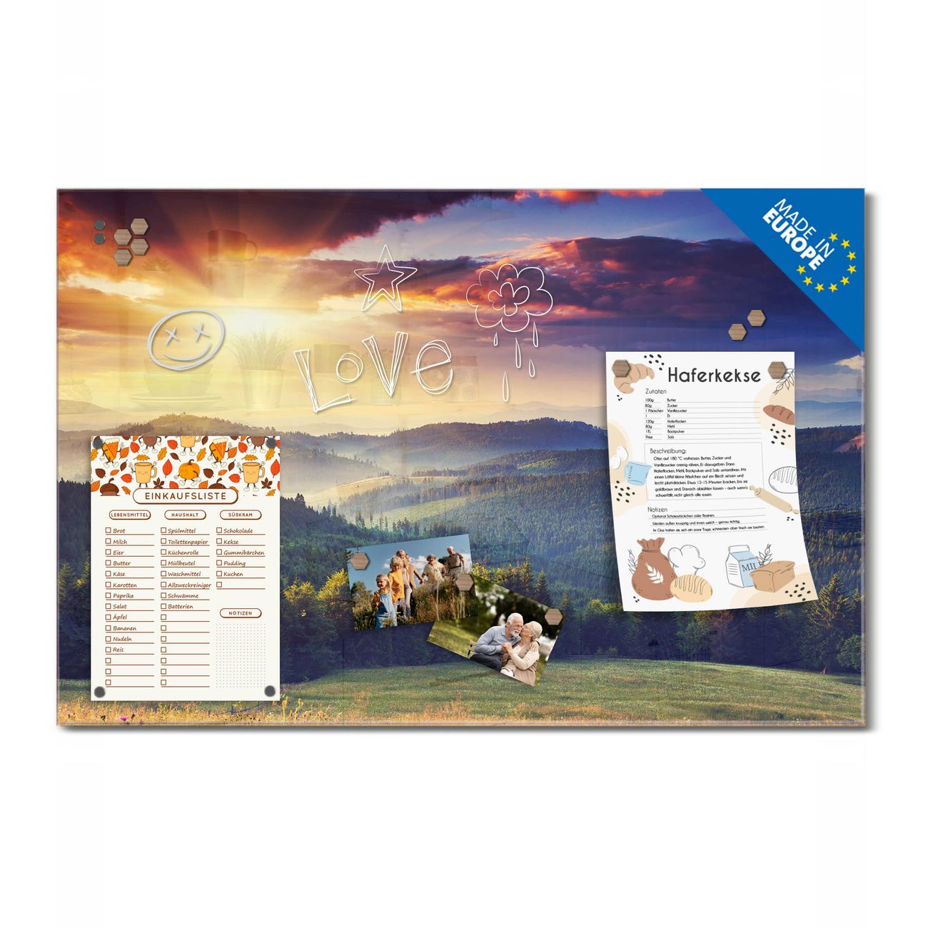 Die banjado Glas Magnettafel im Querformat mit Motiv Motiv Karpaten Sonnenuntergang bringt Ordnung in Ihr Zettelchaos. Fotos, Termine, Notizen oder Rezepte lassen Sich hier stilvoll mit Magneten ordnen, so behalten Sie alles Wichtige im Blick. Das Memoboard aus Glas ist beschreibbar und wird Ihnen bereits mit 4 Neodym-Magneten geliefert. Das Format bietet Ihnen ausreichend Platz um alle wichtigen Informationen im Blick zu behalten.