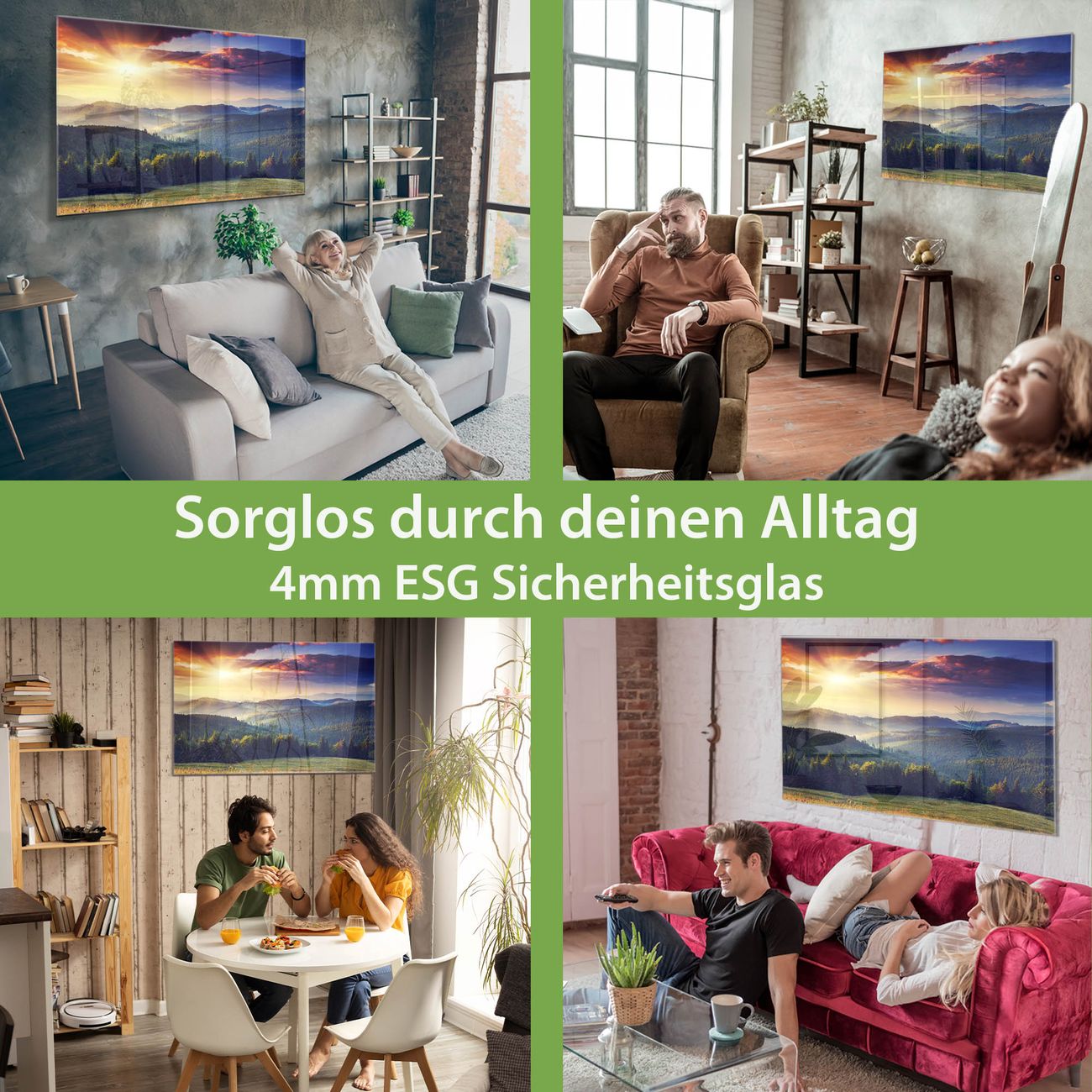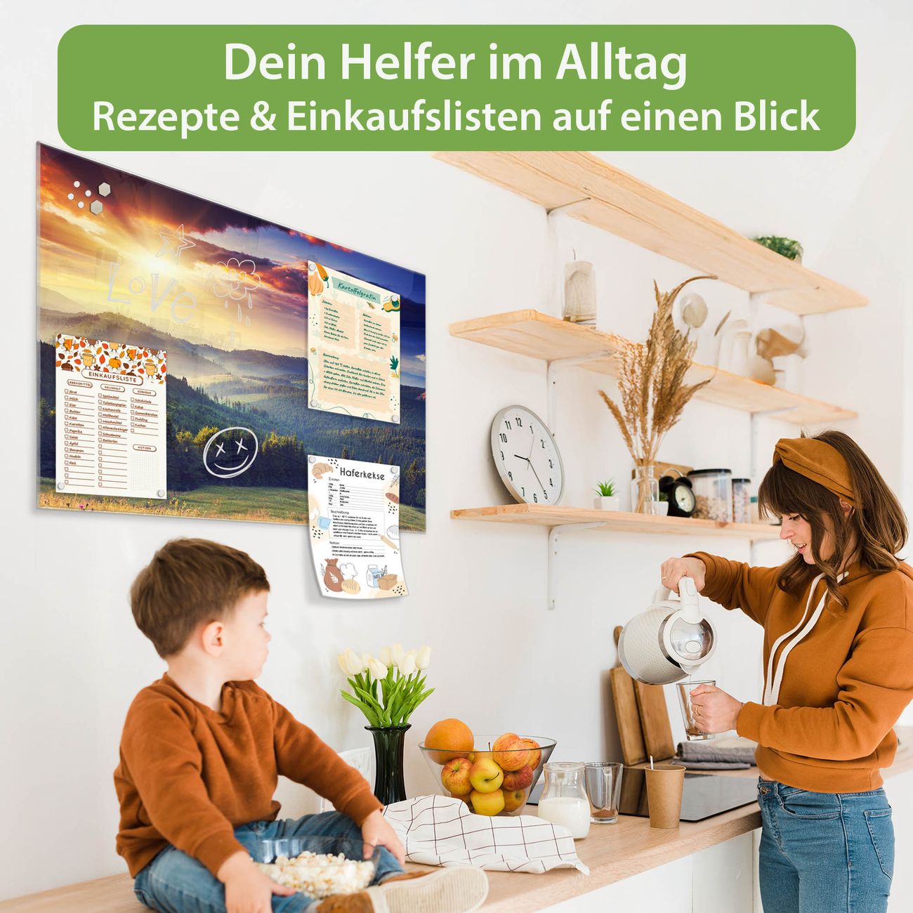 Material: 4mm Sicherheitsglas mit Metallrückwand Eigenschaften: beschreibbar, magnetisch, kratzfest Maße: 45x30x0,6cm, 2,03kg schwer Motiv Nummer 12313 Karpaten Sonnenuntergang Zubehör: inklusive 4 Neodym-Magnete