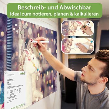 Das Magnetboard besteht aus gehärtetem Glas, die Rückwand aus einem magnetischen Stahlblech. Durch die superflache Bauweise haben Sie die Wahl aus einer Vielzahl von Befestigungsmöglichkeiten. Sie können die Magnettafel mit einem Montagekleber superflach an die Wand kleben oder Sie wählen eines unserer passenden Befestigungssets, welches eine optimale Montage garantiert. Die Magnetwand besteht aus zertifiziertem Sicherheitsglas. Durch die mitgelieferten 4 Neodym-Magnete ist Ihre Glas Magnettafel sofort einsatzbereit. Wichtige Notizen und Informationen können Sie einfach mit Kreidestiften auf die Glasmagnettafel schreiben und rückstandslos wieder entfernen.