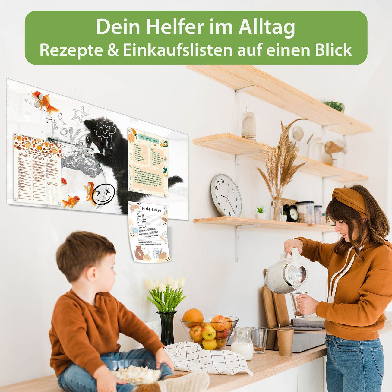 Ein Stück Design, das Ihren Alltag organisiert. Schreiben, heften, inspirieren - alles an einem Ort. Qualität, die man spürt. Montage leicht gemacht. Handwerk mit Herz - veredelt in Sachsen. Einzigartiges Design mit Motiv Motiv Katze Und Fisch Beschreibbare Glasoberfläche, leicht zu reinigen Starke Magnetkraft durch Stahlrückwand Inklusive 4 Neodym-Magneten Flexible Montageoptionen Handveredelt in Sachsen - Qualität, die bleibt