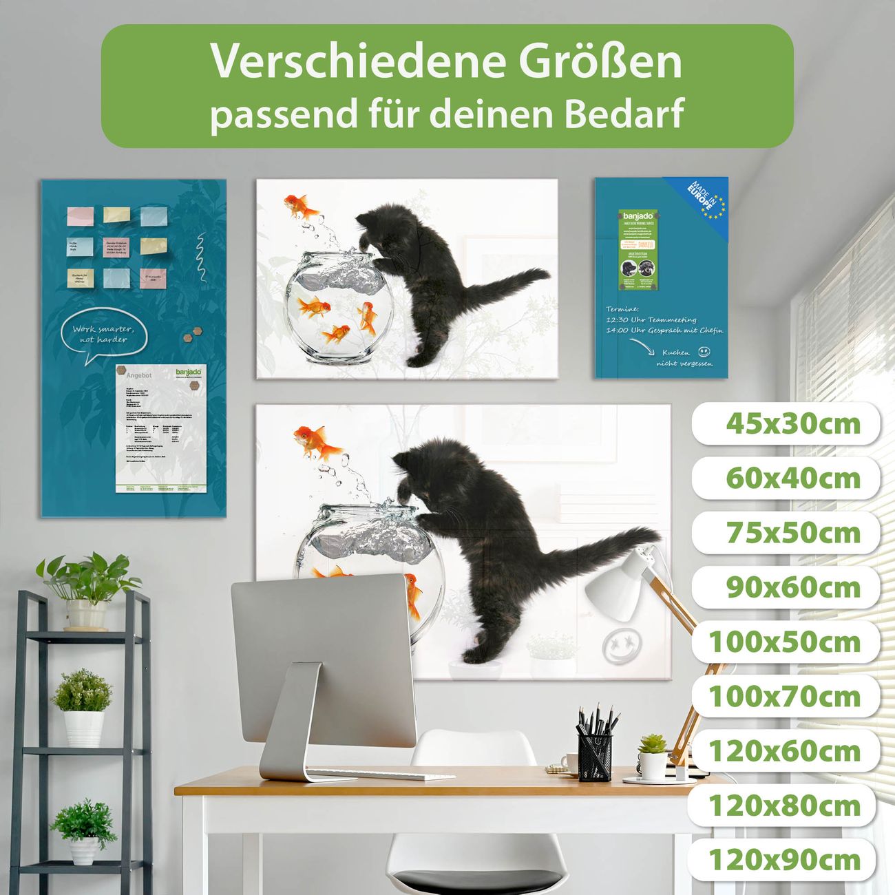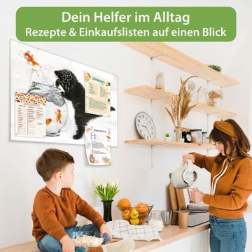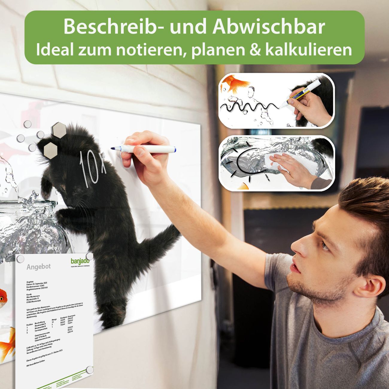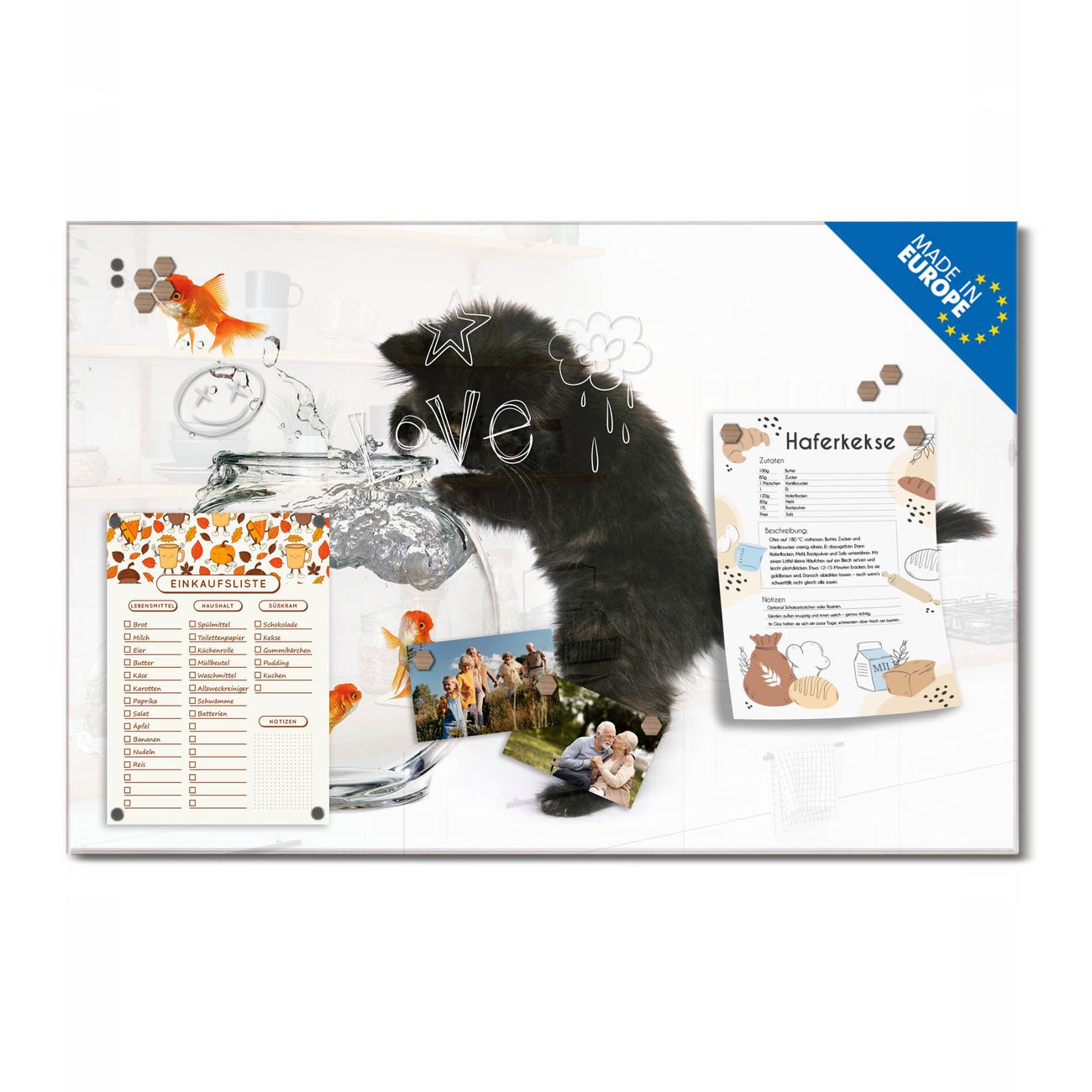 Material: 4mm Sicherheitsglas mit Metallrückwand Eigenschaften: beschreibbar, magnetisch, kratzfest Maße: 120x60x0,6cm, 10,80kg schwer Motiv Nummer 12355 Katze Und Fisch Zubehör: inklusive 4 Neodym-Magnete
