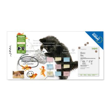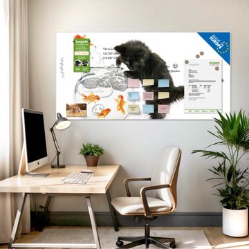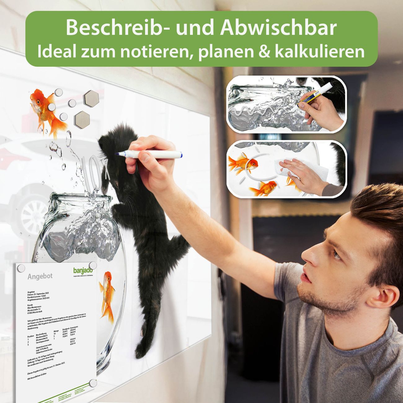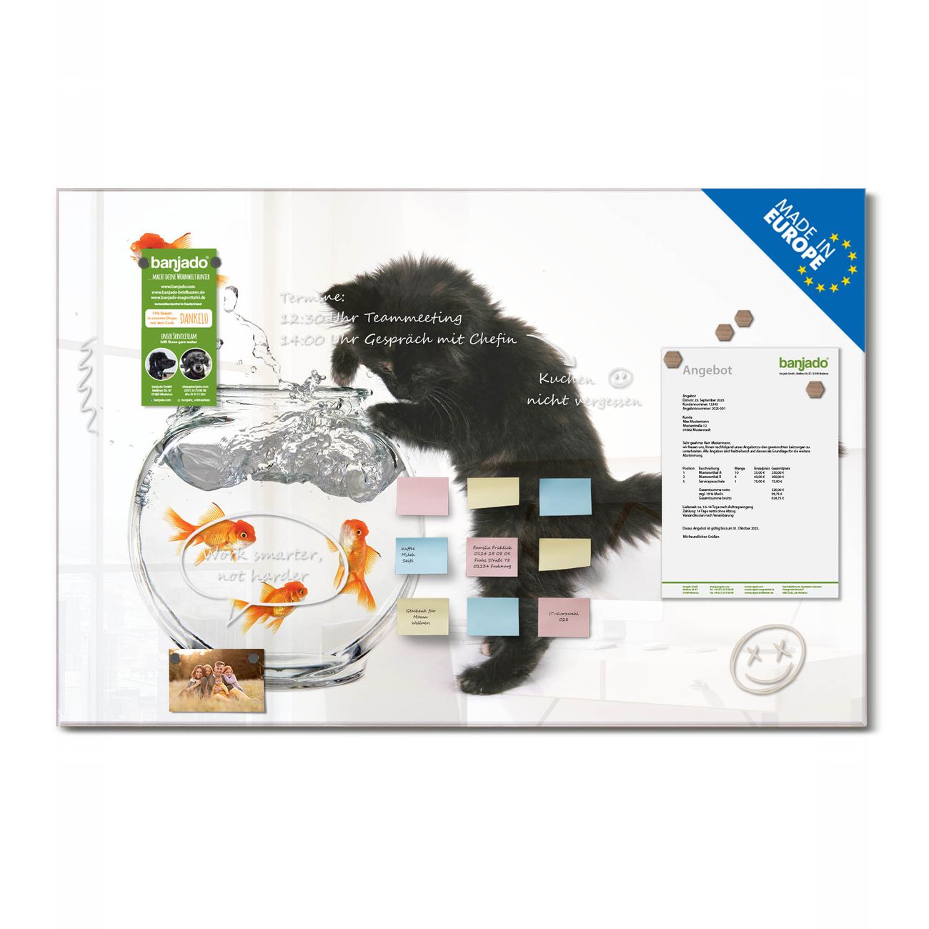 Material: 4mm Sicherheitsglas mit Metallrückwand Eigenschaften: beschreibbar, magnetisch, kratzfest Maße: 120x60x0,6cm, 10,80kg schwer Motiv Nummer 12355 Katze Und Fisch Zubehör: inklusive 4 Neodym-Magnete