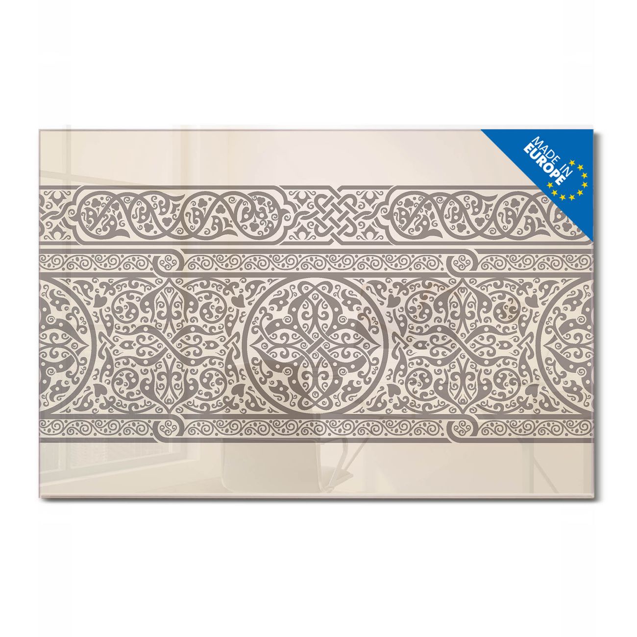 Material: 4mm Sicherheitsglas mit Metallrückwand Eigenschaften: beschreibbar, magnetisch, kratzfest Maße: 120x80x0,6cm, 14,40kg schwer Motiv Nummer 11326 Keltischer Knoten Zubehör: inklusive 4 Neodym-Magnete