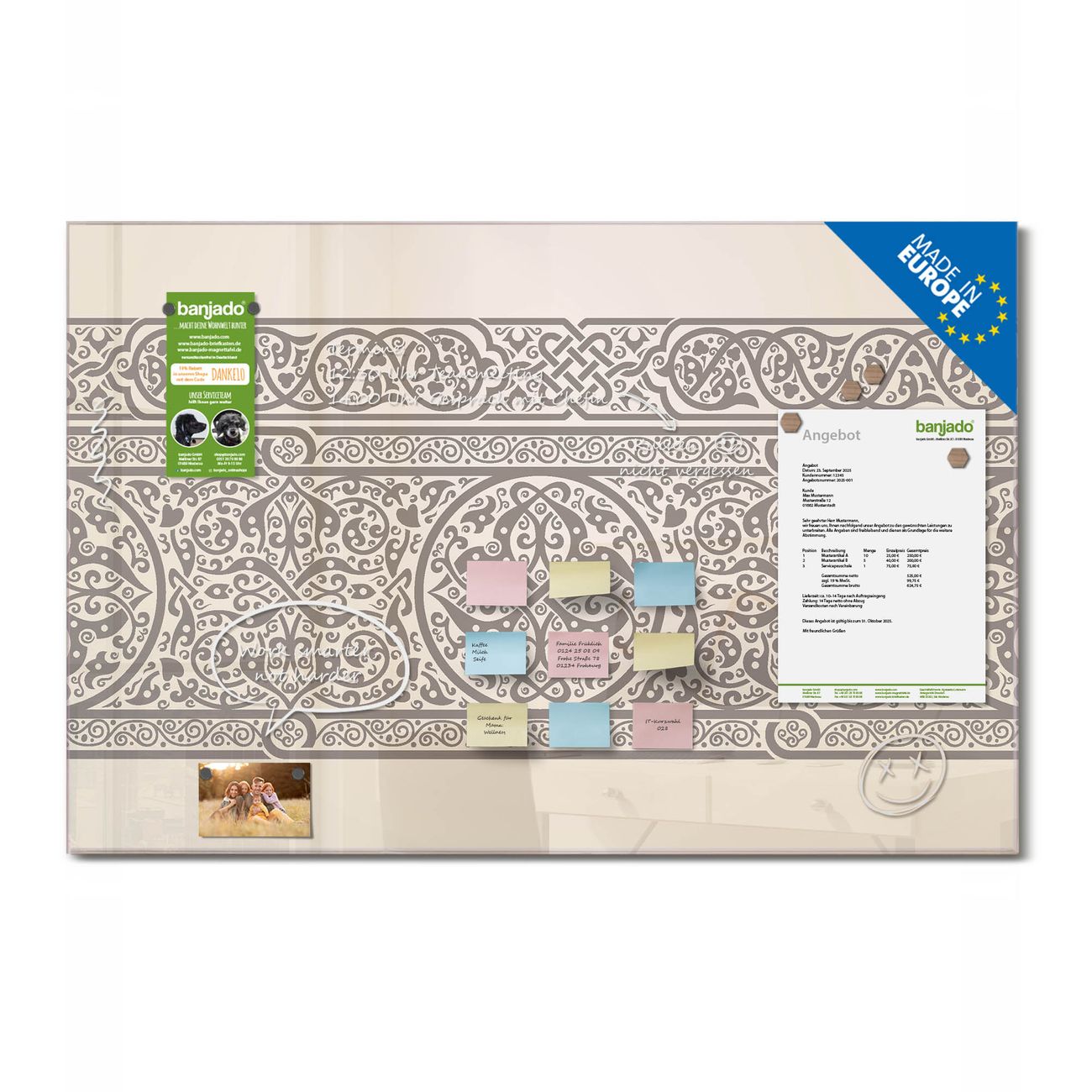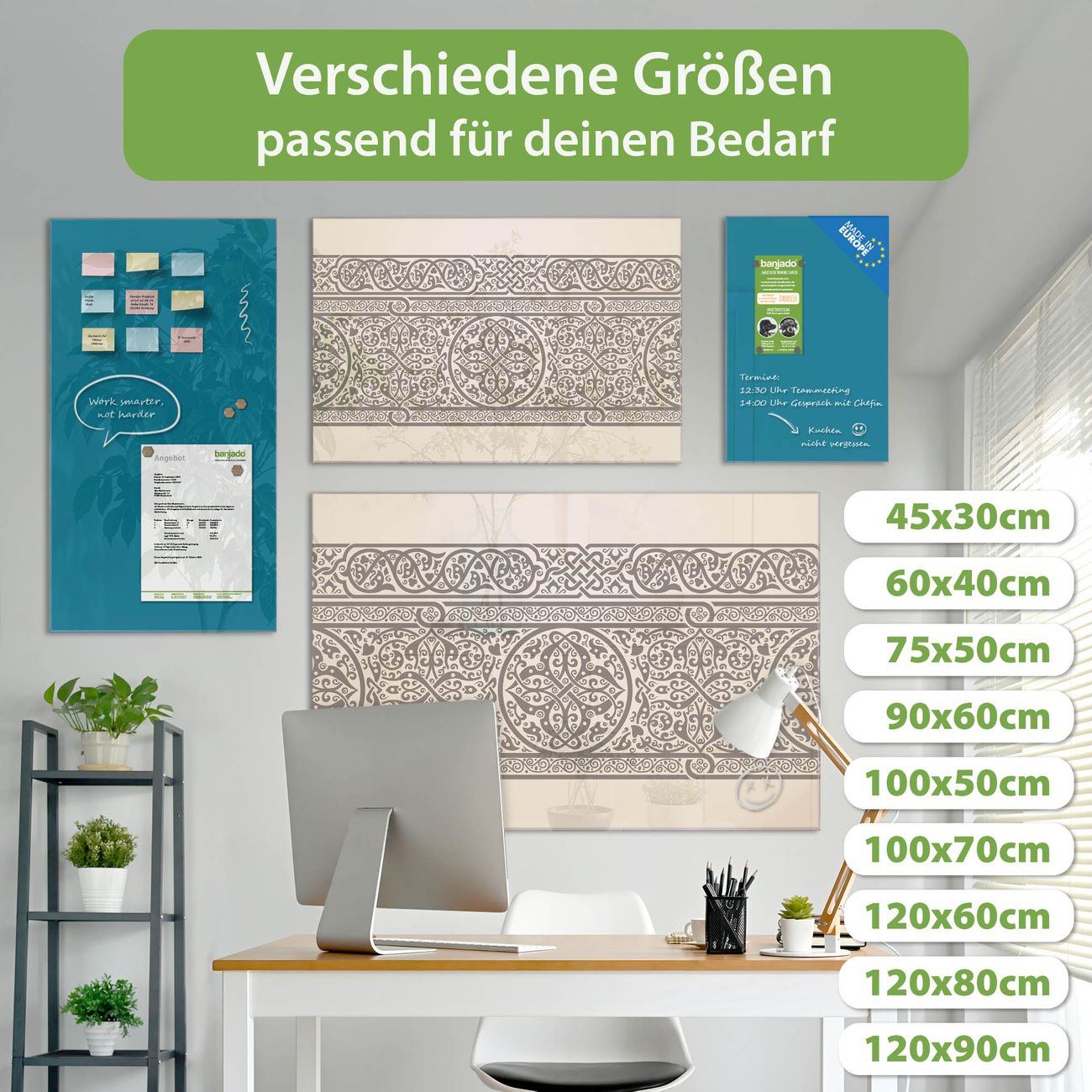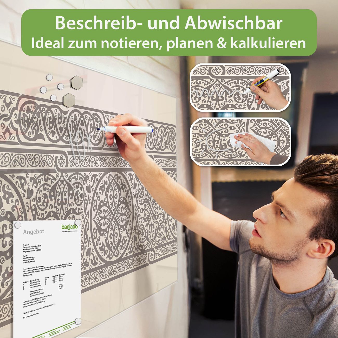 Jede Glas Magnettafel wird in unserer Werkstatt von Hand gefertigt und sorgfältig geprüft. So erhalten Sie ein echtes Qualitätsprodukt, das Funktion und Ästhetik perfekt vereint.?? Warum banjado?