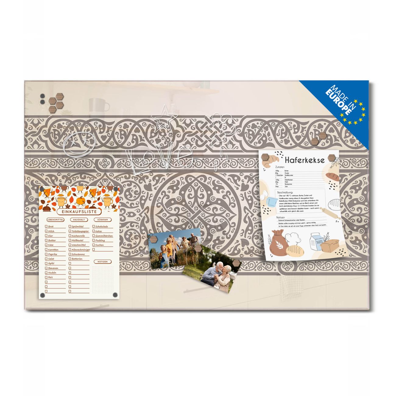 Ein Stück Design, das Ihren Alltag organisiert. Schreiben, heften, inspirieren - alles an einem Ort. Qualität, die man spürt. Montage leicht gemacht. Handwerk mit Herz - veredelt in Sachsen. Einzigartiges Design mit Motiv Motiv Keltischer Knoten Beschreibbare Glasoberfläche, leicht zu reinigen Starke Magnetkraft durch Stahlrückwand Inklusive 4 Neodym-Magneten Flexible Montageoptionen Handveredelt in Sachsen - Qualität, die bleibt
