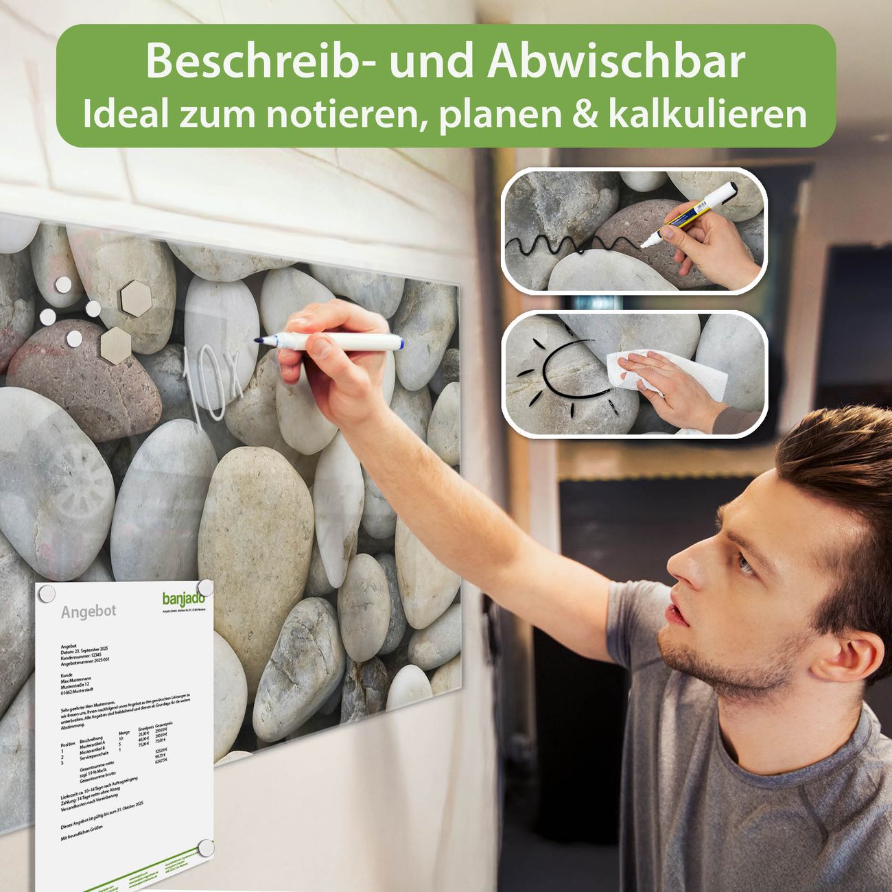 Material: 4mm Sicherheitsglas mit Metallrückwand Eigenschaften: beschreibbar, magnetisch, kratzfest Maße: 120x60x0,6cm, 10,80kg schwer Motiv Nummer 10169 Kieselsteine Zubehör: inklusive 4 Neodym-Magnete