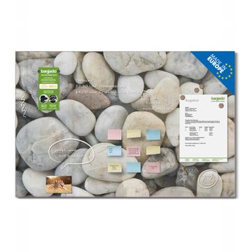 Material: 4mm Sicherheitsglas mit Metallrückwand Eigenschaften: beschreibbar, magnetisch, kratzfest Maße: 120x80x0,6cm, 14,40kg schwer Motiv Nummer 10169 Kieselsteine Zubehör: inklusive 4 Neodym-Magnete