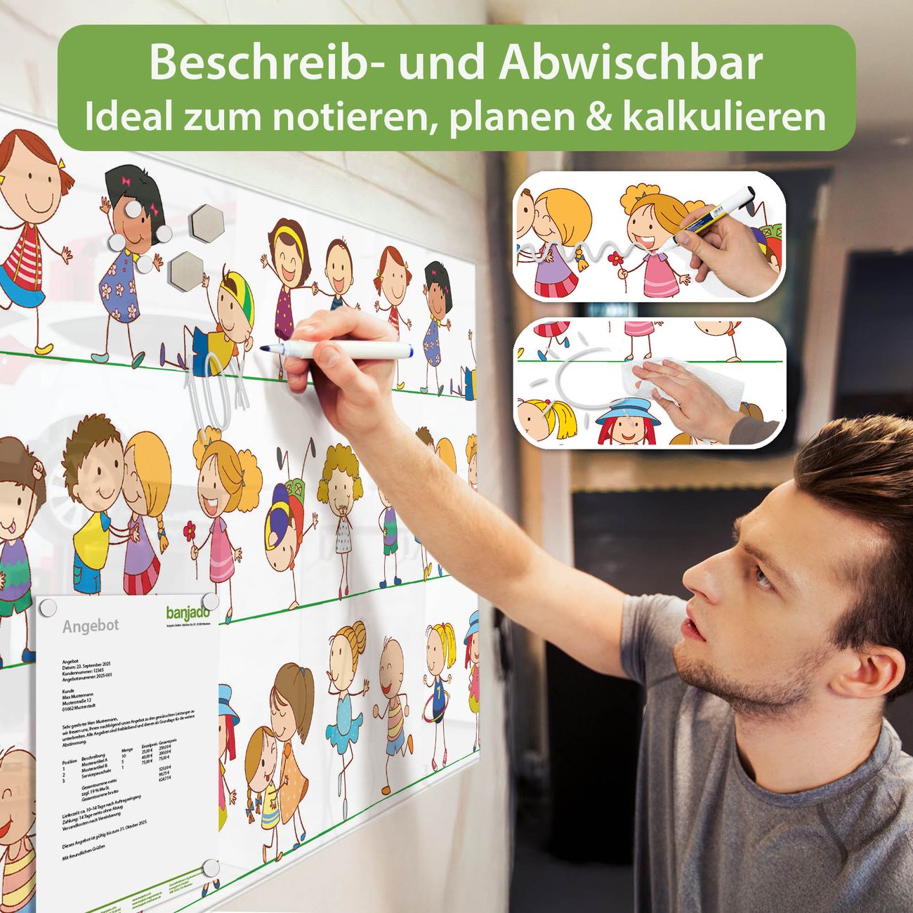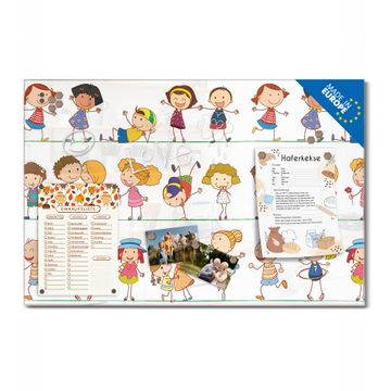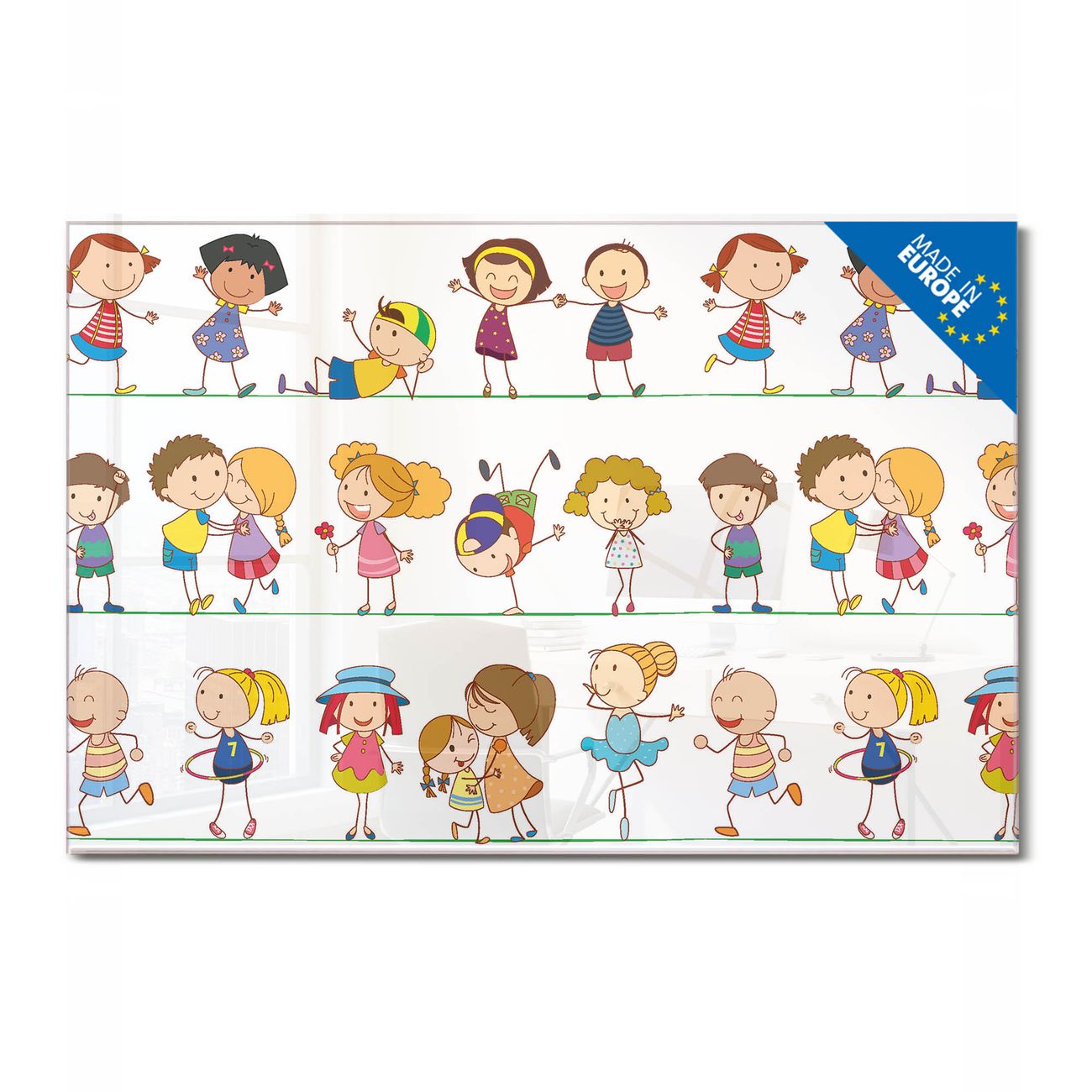 Material: 4mm Sicherheitsglas mit Metallrückwand Eigenschaften: beschreibbar, magnetisch, kratzfest Maße: 75x50x0,6cm, 5,63kg schwer Motiv Nummer 10882 Kinder Zubehör: inklusive 4 Neodym-Magnete