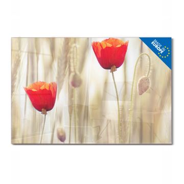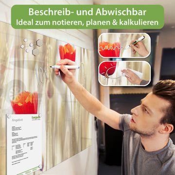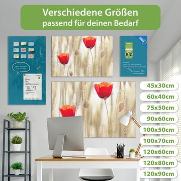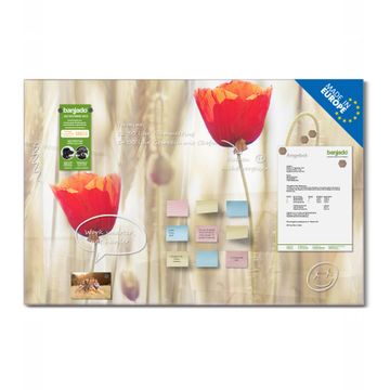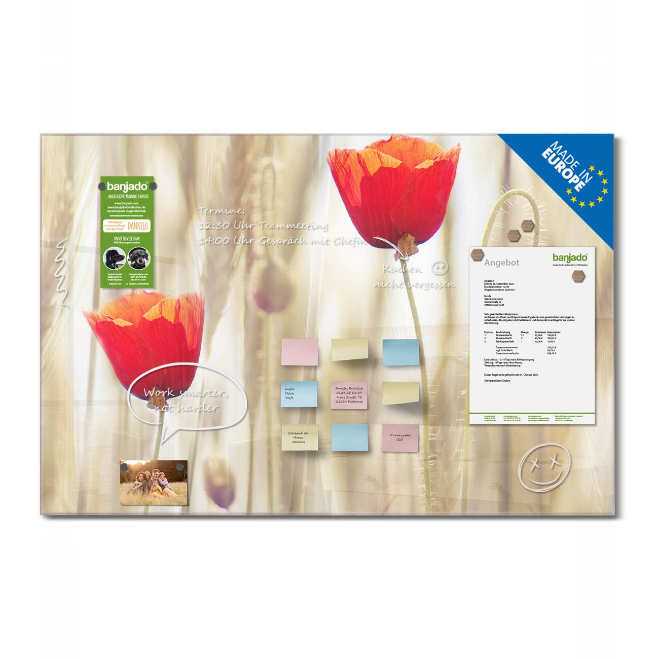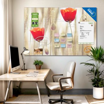 Material: 4mm Sicherheitsglas mit Metallrückwand Eigenschaften: beschreibbar, magnetisch, kratzfest Maße: 120x80x0,6cm, 14,40kg schwer Motiv Nummer 12261 Klatschmohn Zubehör: inklusive 4 Neodym-Magnete
