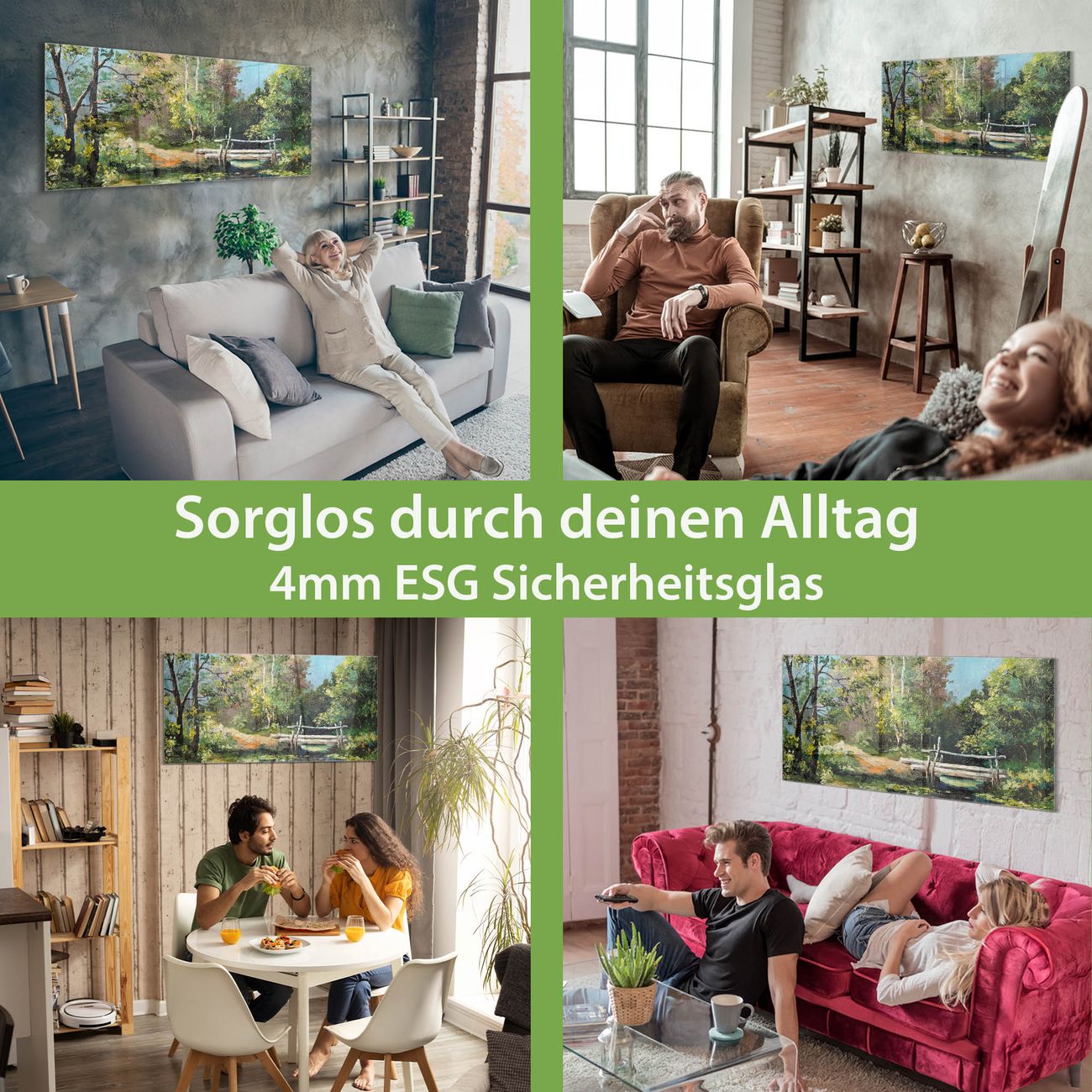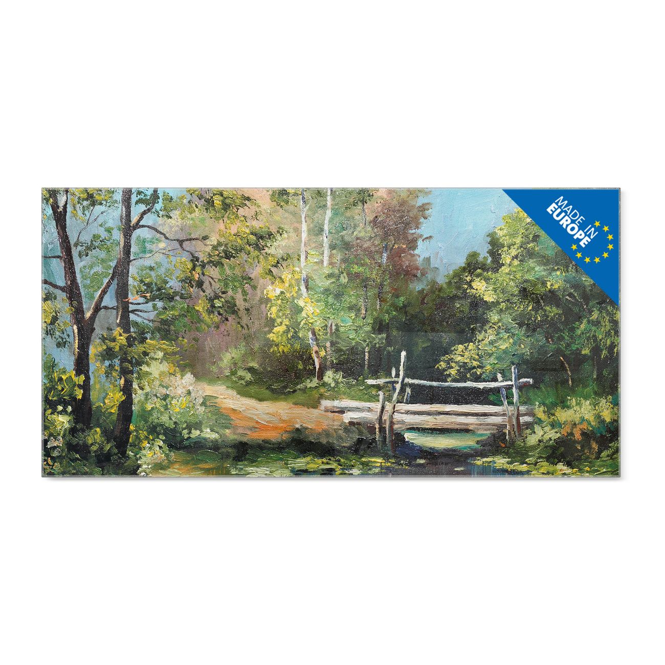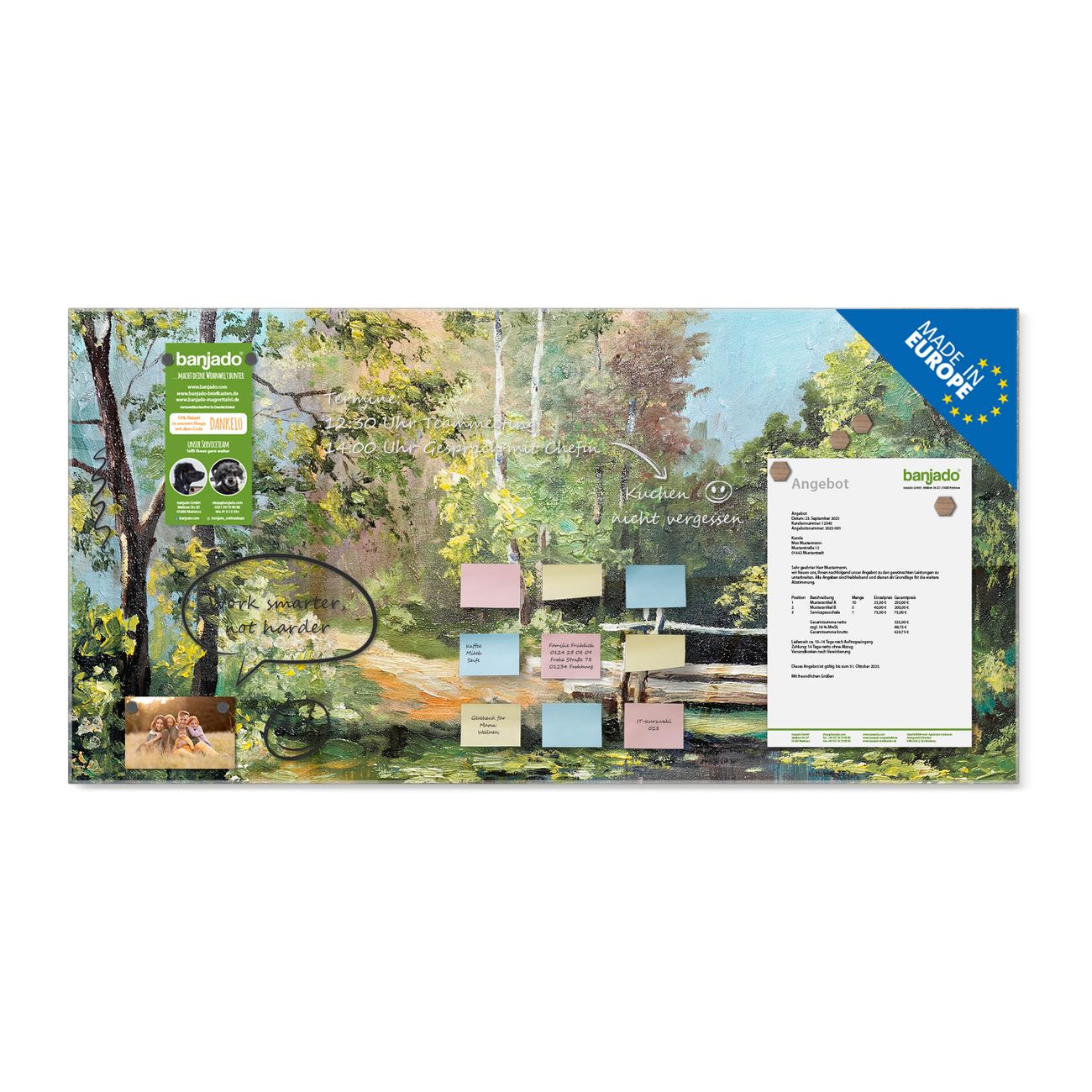 Material: 4mm Sicherheitsglas mit Metallrückwand Eigenschaften: beschreibbar, magnetisch, kratzfest Maße: 100x50x0,6cm, 7,50kg schwer Motiv Nummer 12353 Kleine Brücke Zubehör: inklusive 4 Neodym-Magnete