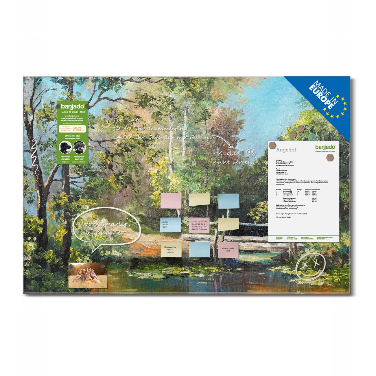 Material: 4mm Sicherheitsglas mit Metallrückwand Eigenschaften: beschreibbar, magnetisch, kratzfest Maße: 120x80x0,6cm, 14,40kg schwer Motiv Nummer 12353 Kleine Brücke Zubehör: inklusive 4 Neodym-Magnete
