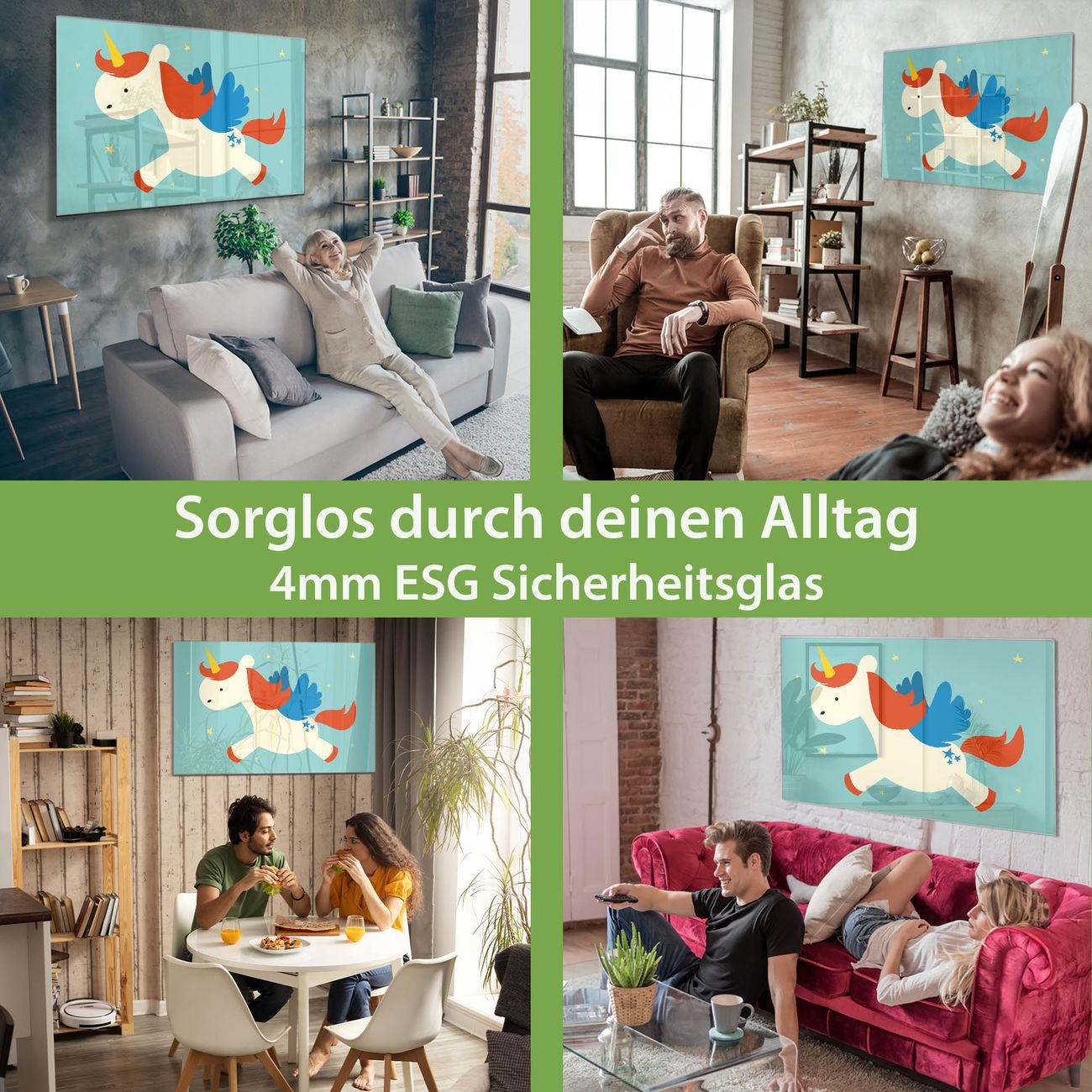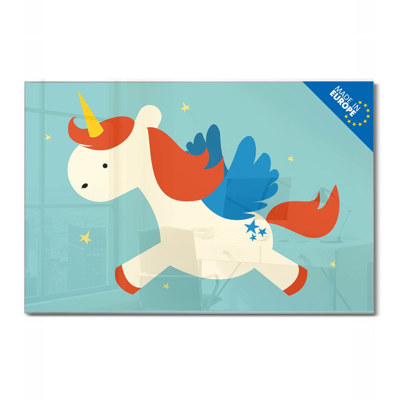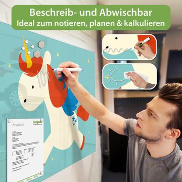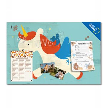 Material: 4mm Sicherheitsglas mit Metallrückwand Eigenschaften: beschreibbar, magnetisch, kratzfest Maße: 75x50x0,6cm, 5,63kg schwer Motiv Nummer 11904 Kleines Einhorn Zubehör: inklusive 4 Neodym-Magnete