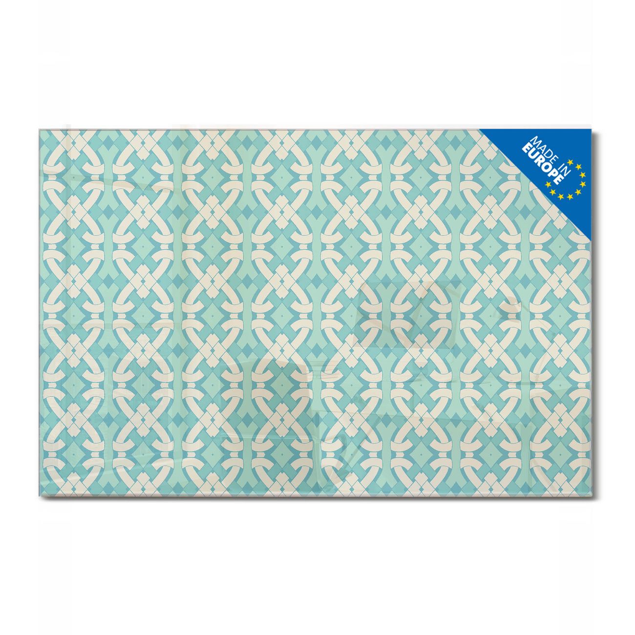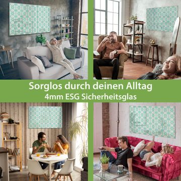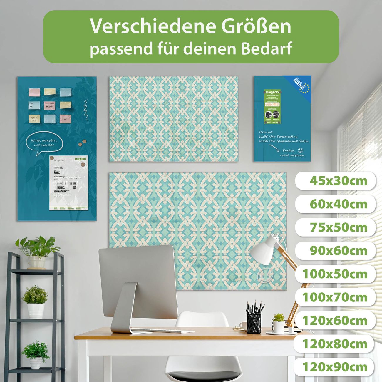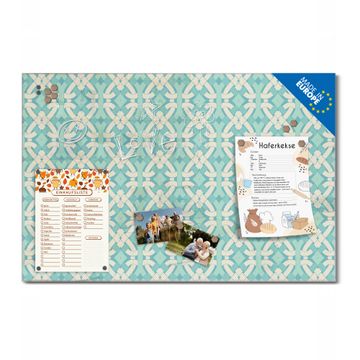 Material: 4mm Sicherheitsglas mit Metallrückwand Eigenschaften: beschreibbar, magnetisch, kratzfest Maße: 45x30x0,6cm, 2,03kg schwer Motiv Nummer 11872 Knoten Türkis Zubehör: inklusive 4 Neodym-Magnete