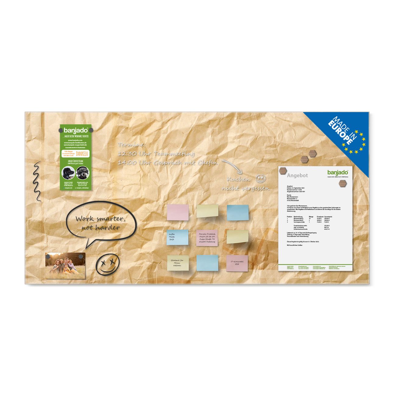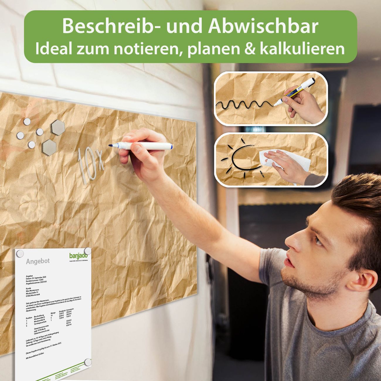 Jede Glas Magnettafel wird in unserer Werkstatt von Hand gefertigt und sorgfältig geprüft. So erhalten Sie ein echtes Qualitätsprodukt, das Funktion und Ästhetik perfekt vereint.?? Warum banjado?