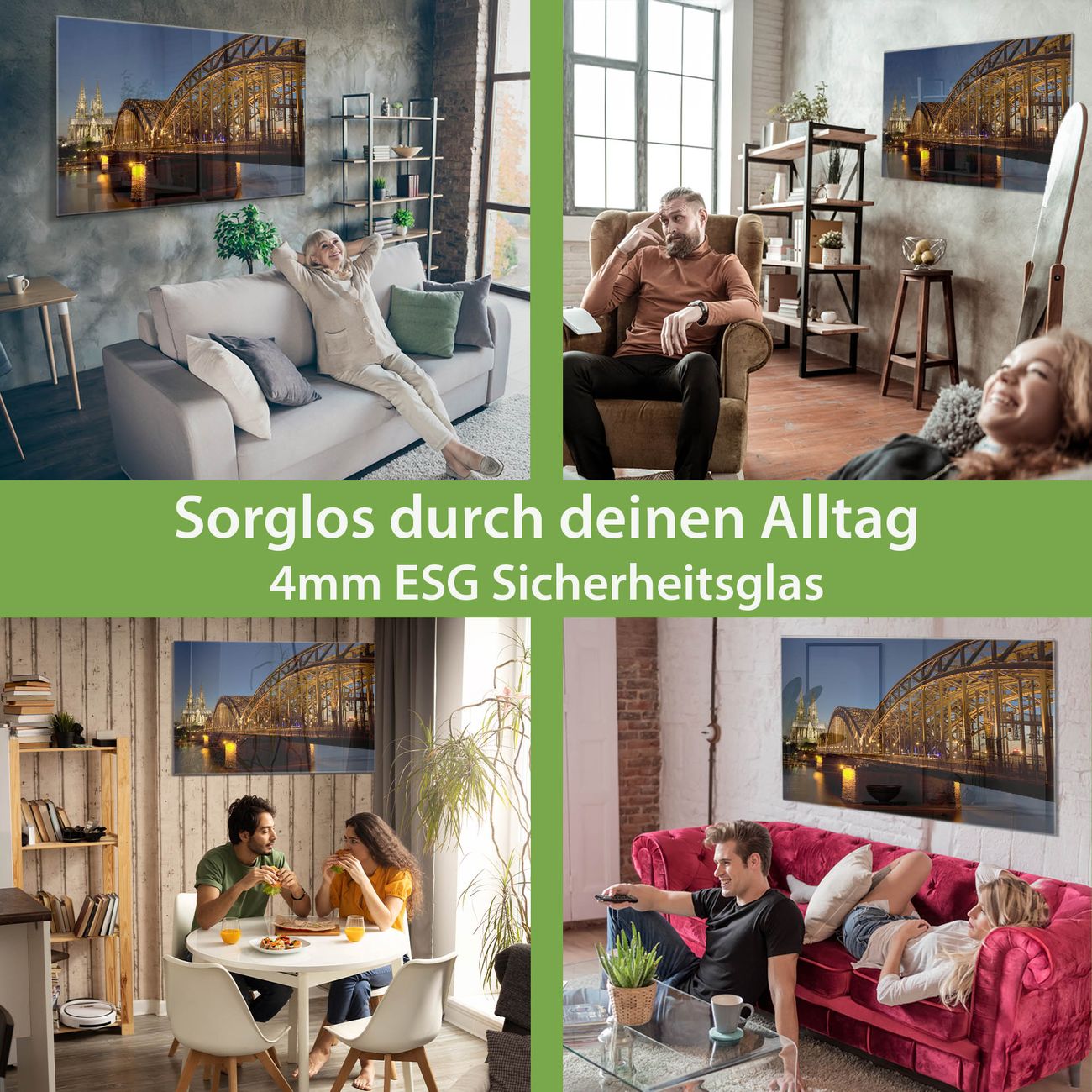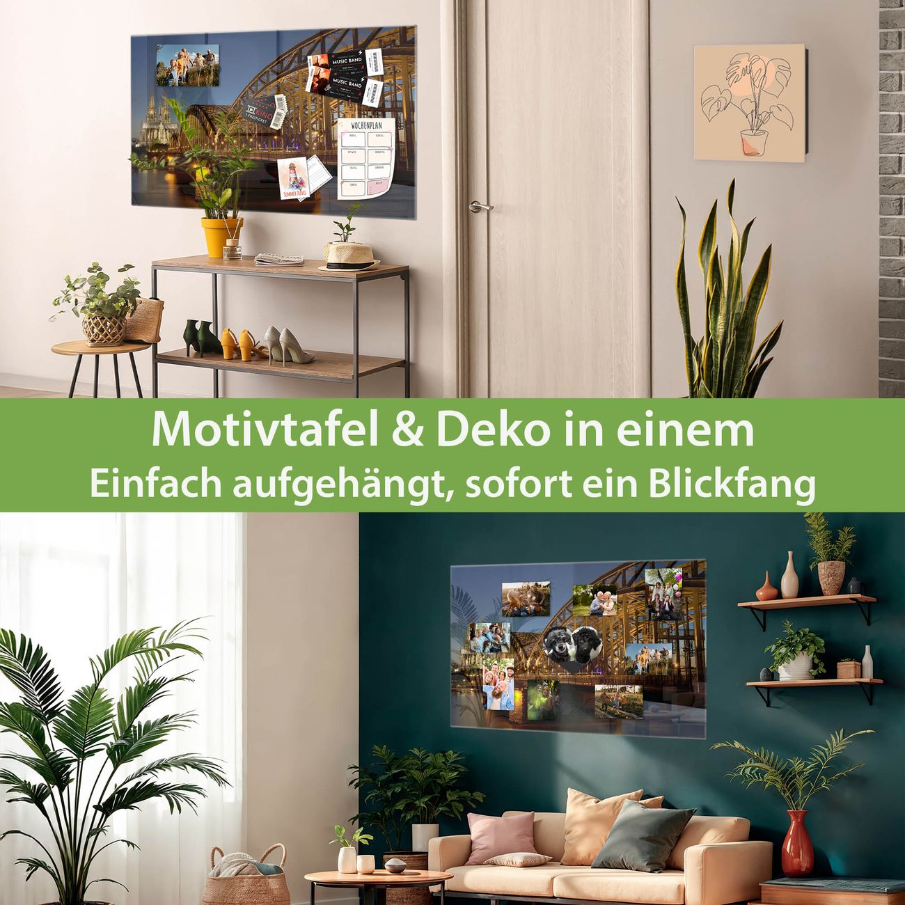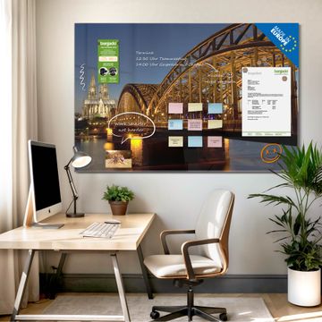 Material: 4mm Sicherheitsglas mit Metallrückwand Eigenschaften: beschreibbar, magnetisch, kratzfest Maße: 45x30x0,6cm, 2,03kg schwer Motiv Nummer 10135 Köln Zubehör: inklusive 4 Neodym-Magnete