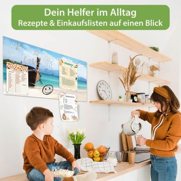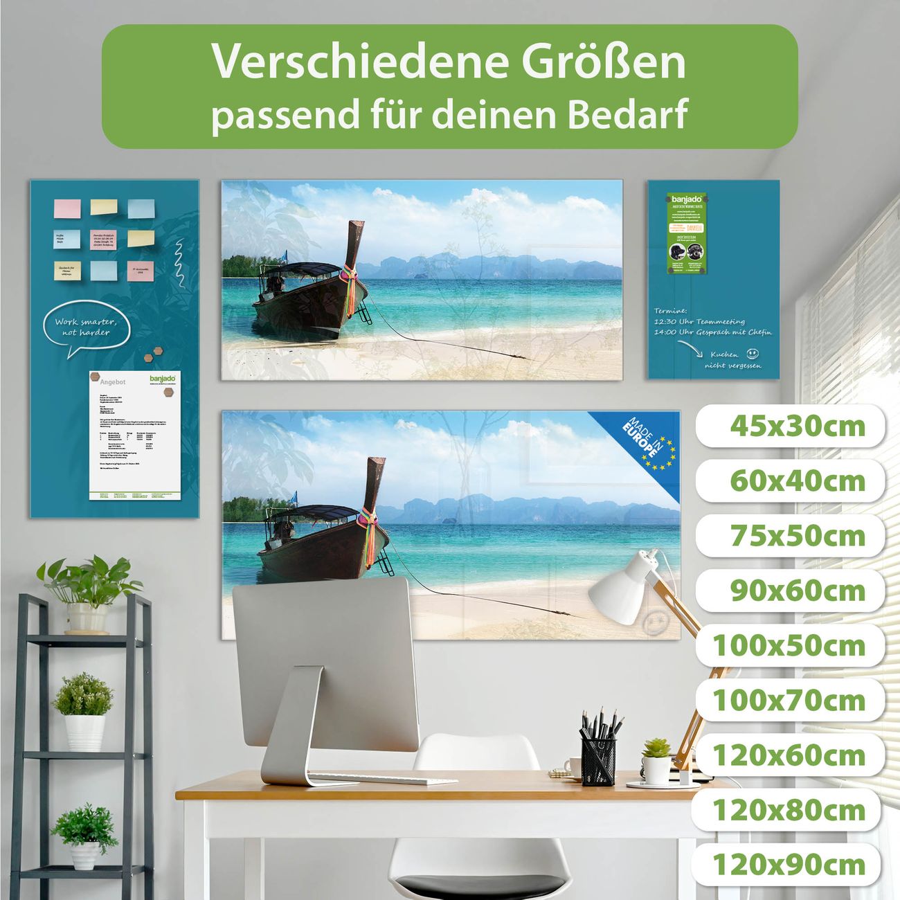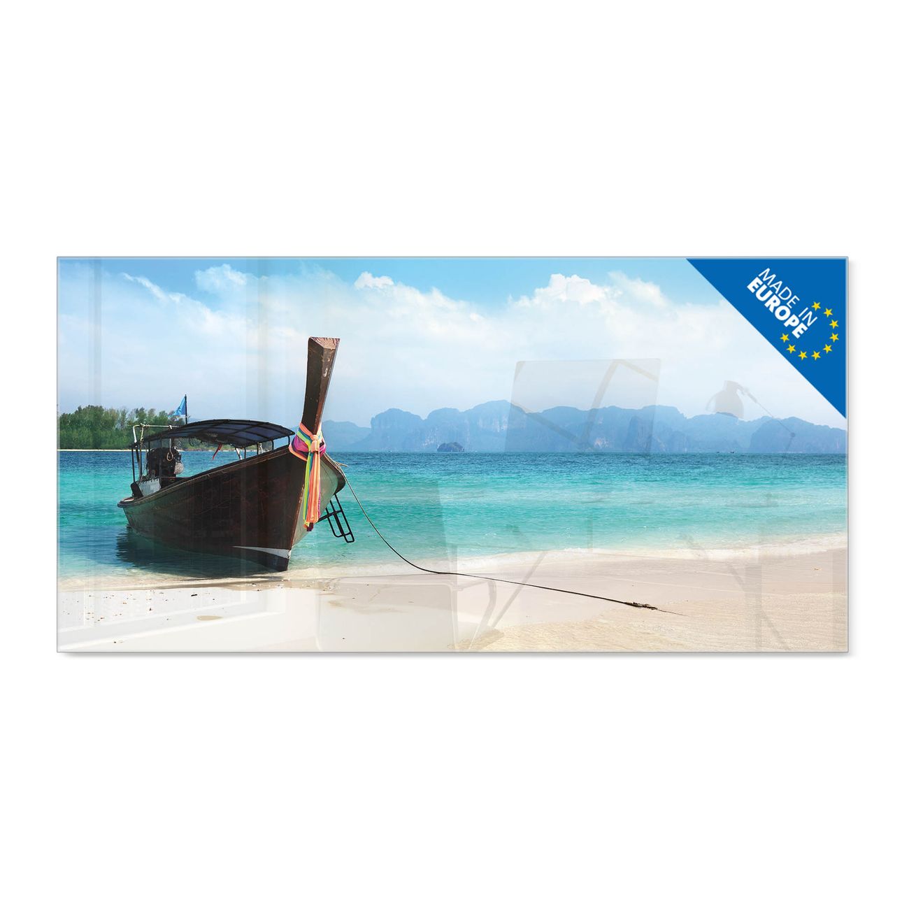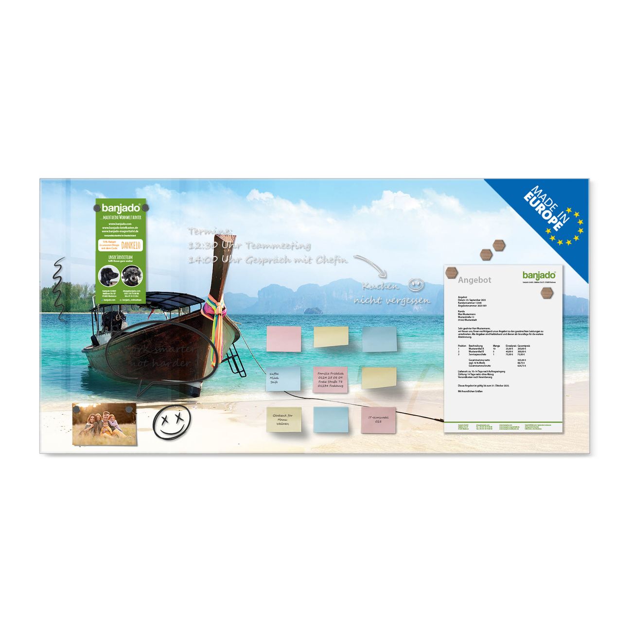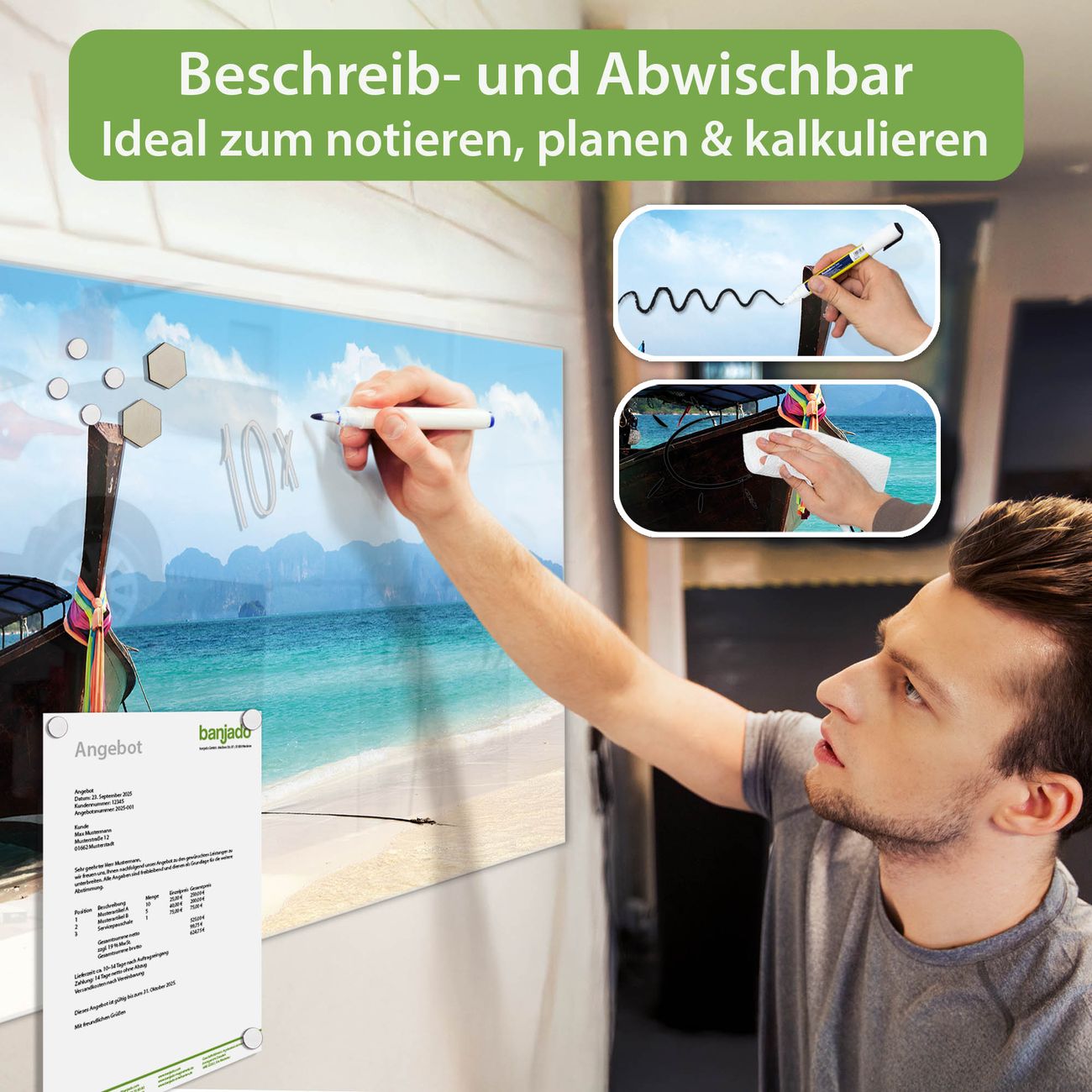 Material: 4mm Sicherheitsglas mit Metallrückwand Eigenschaften: beschreibbar, magnetisch, kratzfest Maße: 100x50x0,6cm, 7,50kg schwer Motiv Nummer 12269 Koh Poda Zubehör: inklusive 4 Neodym-Magnete