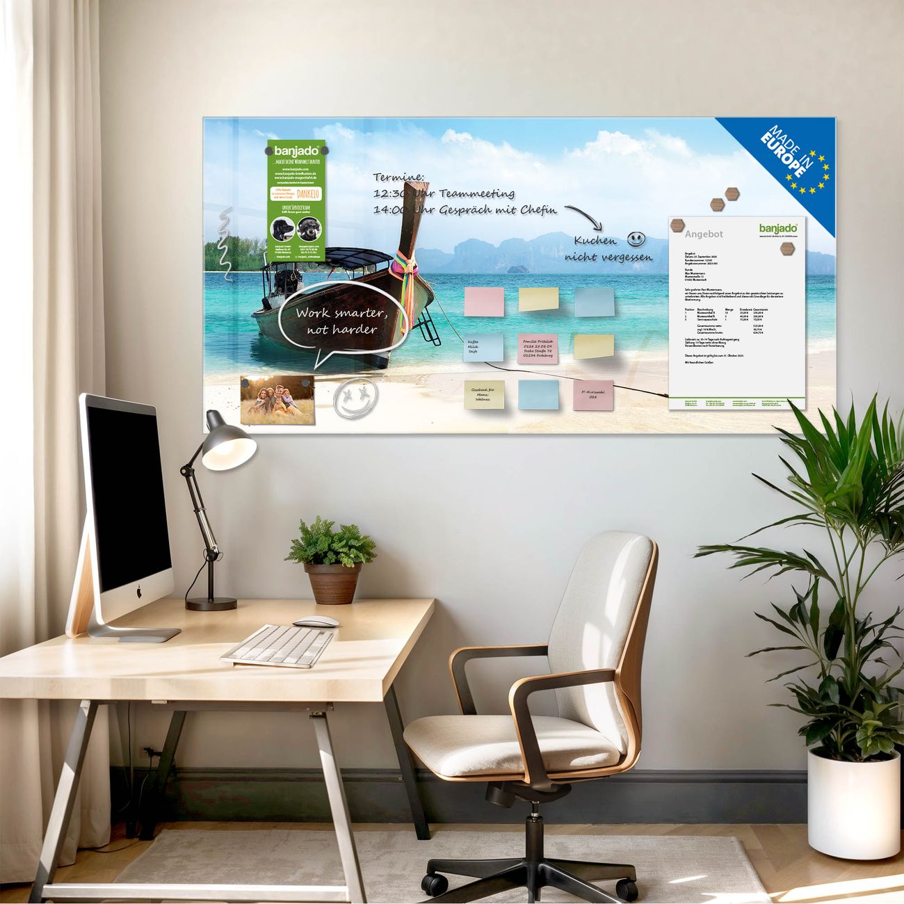 Die banjado Glas Magnettafel mit dem Motiv Motiv Koh Poda verbindet Funktionalität mit Stil. Sie ersetzt das Zettelchaos durch klare Strukturen und bringt dabei eine warme, natürliche Atmosphäre in Ihr Zuhause. Ob im Büro, in der Küche oder im Eingangsbereich - dieses Design-Board zieht Blicke an und sorgt für Ordnung mit Charakter.