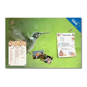Material: 4mm Sicherheitsglas mit Metallrückwand Eigenschaften: beschreibbar, magnetisch, kratzfest Maße: 45x30x0,6cm, 2,03kg schwer Motiv Nummer 10103 Kolibri Zubehör: inklusive 4 Neodym-Magnete