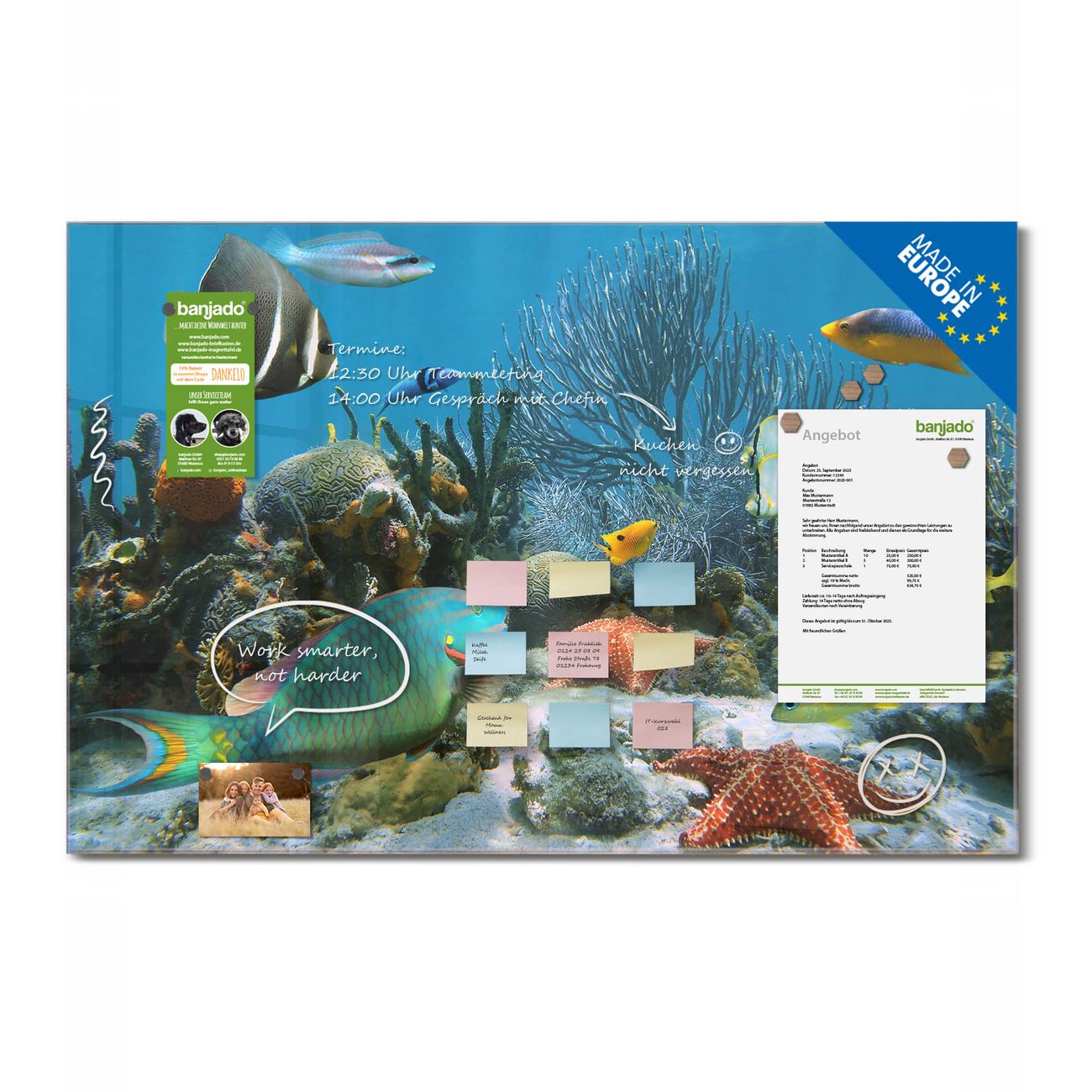 Material: 4mm Sicherheitsglas mit Metallrückwand Eigenschaften: beschreibbar, magnetisch, kratzfest Maße: 120x80x0,6cm, 14,40kg schwer Motiv Nummer 12367 Korallenriff 1 Zubehör: inklusive 4 Neodym-Magnete