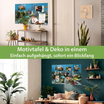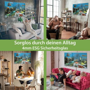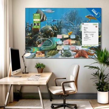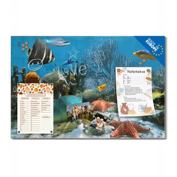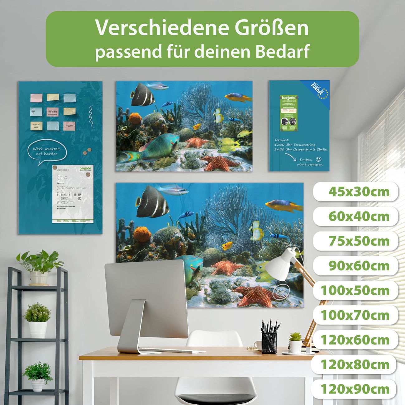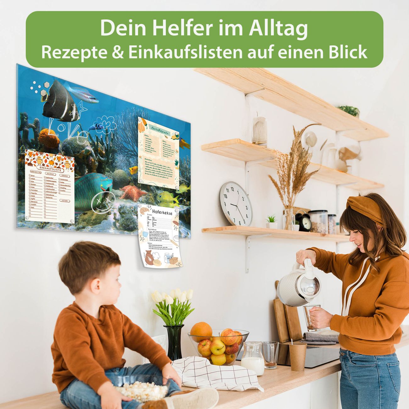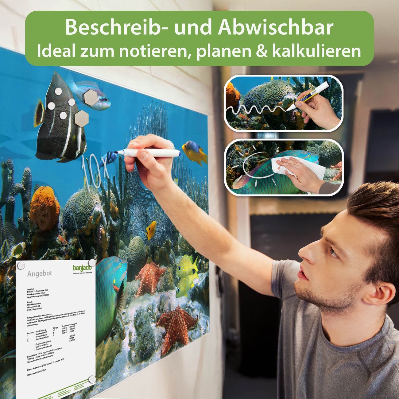 Material: 4mm Sicherheitsglas mit Metallrückwand Eigenschaften: beschreibbar, magnetisch, kratzfest Maße: 75x50x0,6cm, 5,63kg schwer Motiv Nummer 12367 Korallenriff 1 Zubehör: inklusive 4 Neodym-Magnete