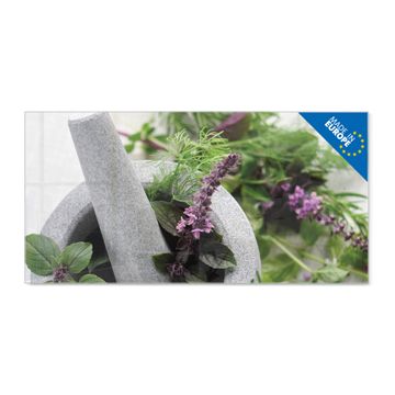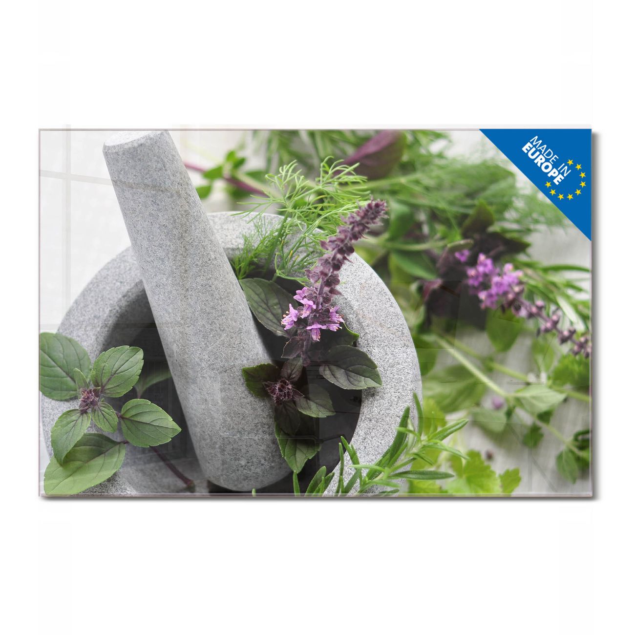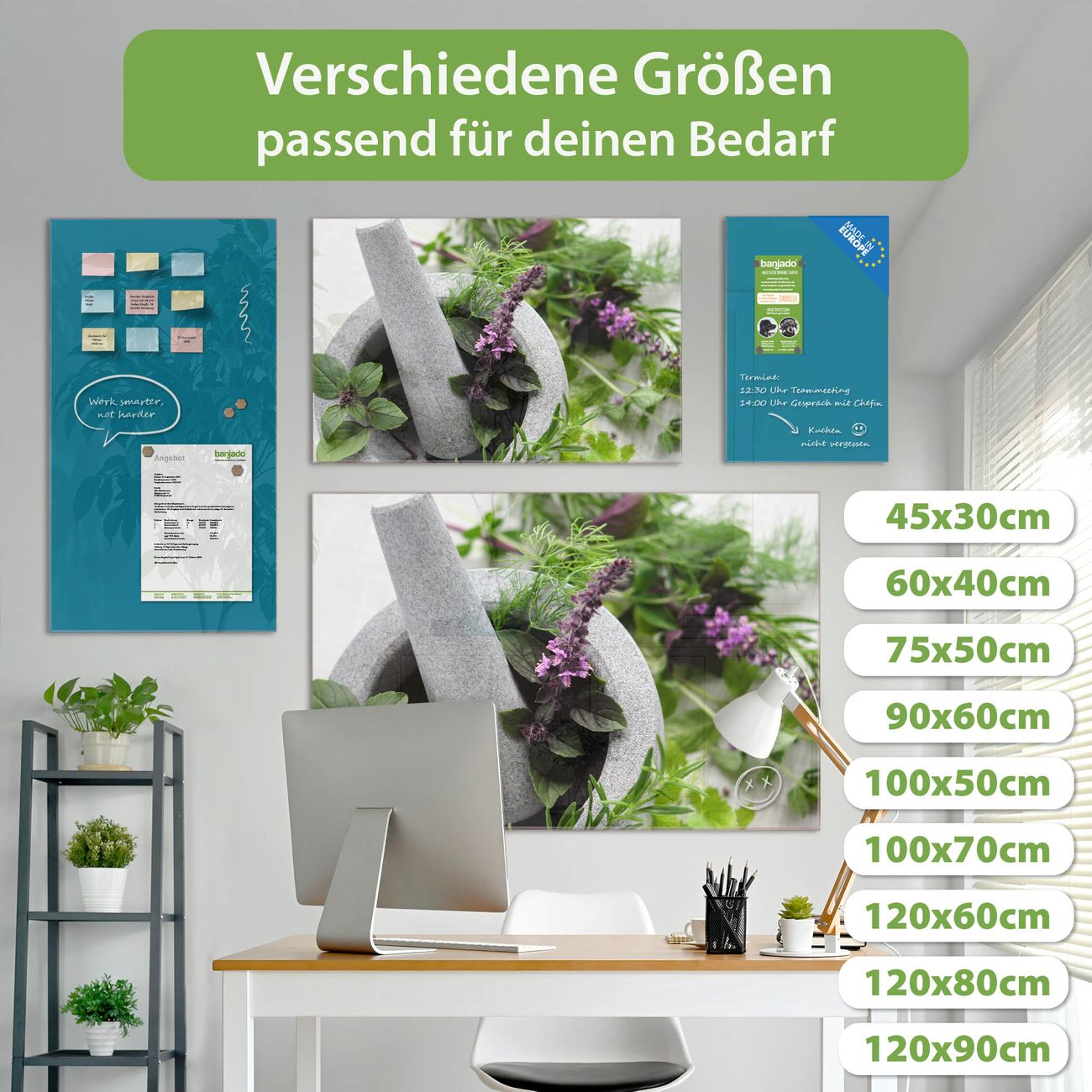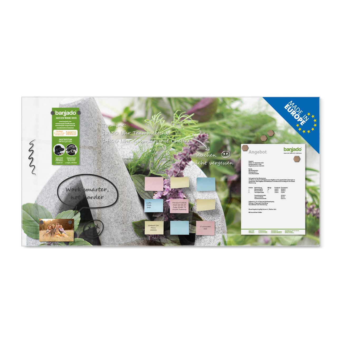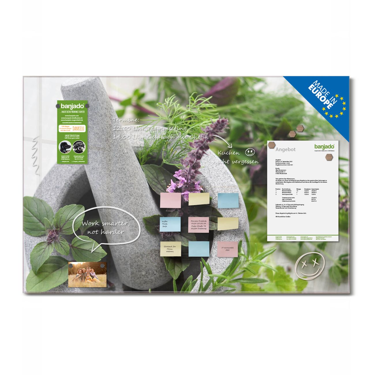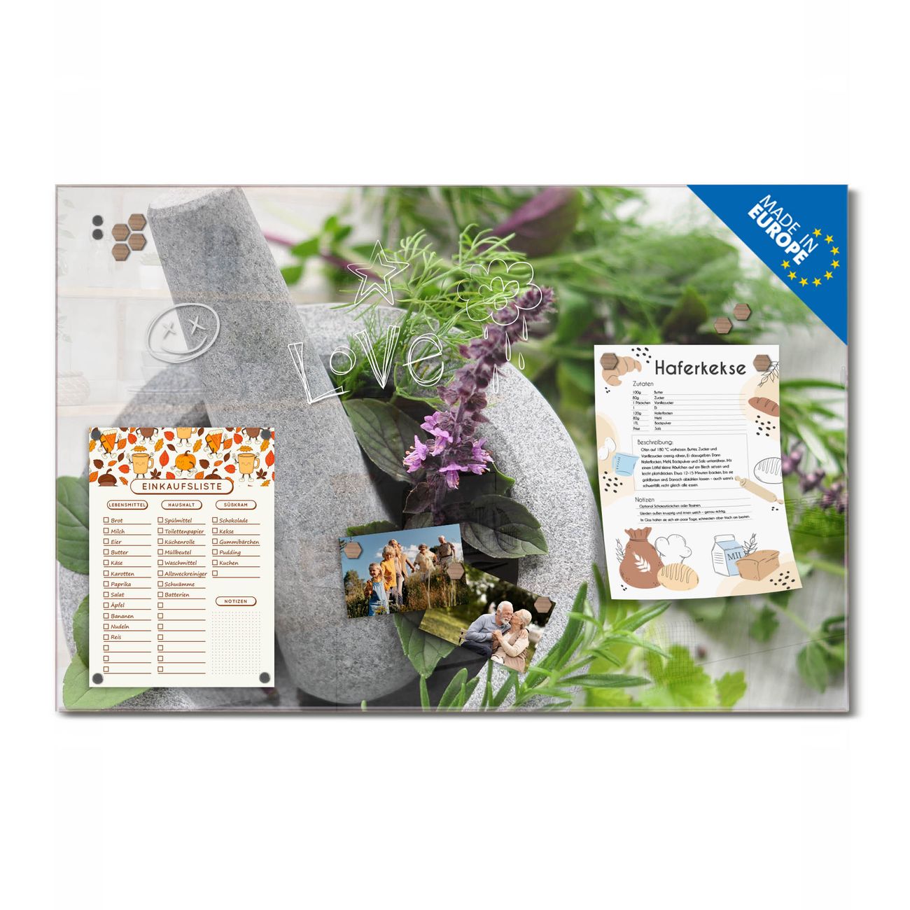 Material: 4mm Sicherheitsglas mit Metallrückwand Eigenschaften: beschreibbar, magnetisch, kratzfest Maße: 120x60x0,6cm, 10,80kg schwer Motiv Nummer 10151 Kräuter Zubehör: inklusive 4 Neodym-Magnete