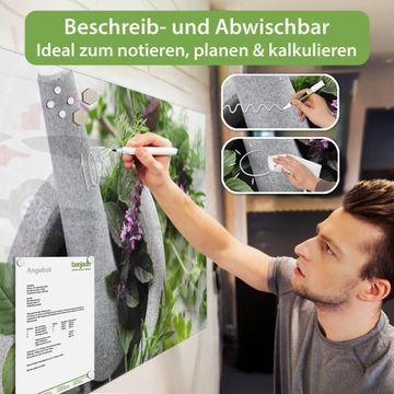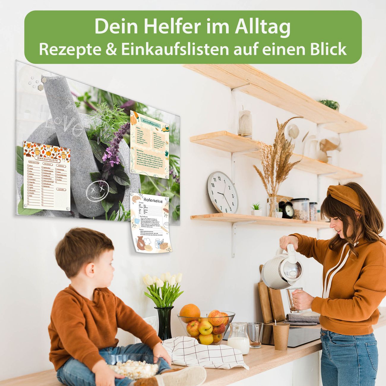 Ein Stück Design, das Ihren Alltag organisiert. Schreiben, heften, inspirieren - alles an einem Ort. Qualität, die man spürt. Montage leicht gemacht. Handwerk mit Herz - veredelt in Sachsen. Einzigartiges Design mit Motiv Motiv Kräuter Beschreibbare Glasoberfläche, leicht zu reinigen Starke Magnetkraft durch Stahlrückwand Inklusive 4 Neodym-Magneten Flexible Montageoptionen Handveredelt in Sachsen - Qualität, die bleibt