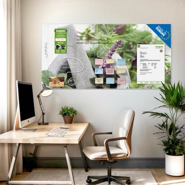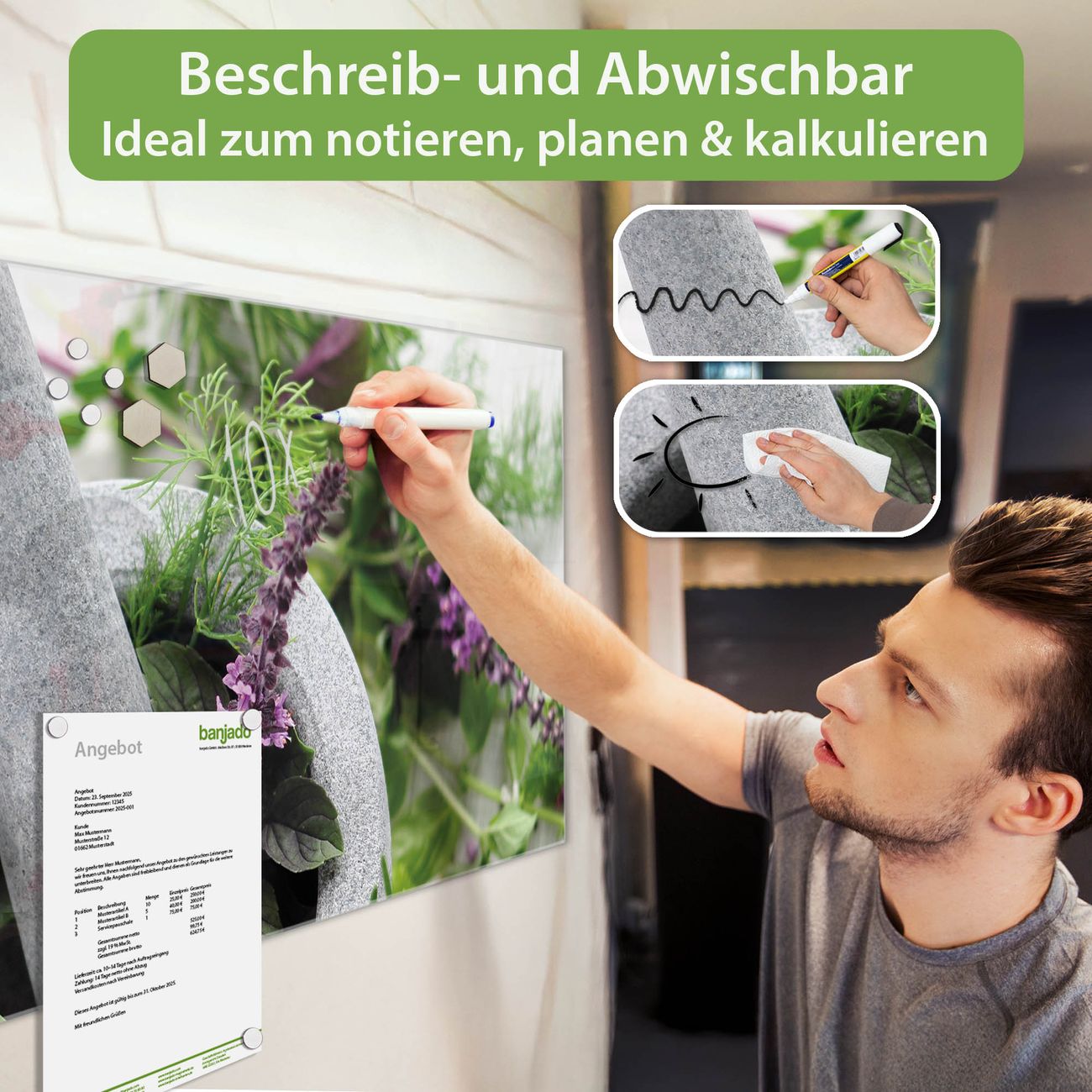 Die banjado Glas Magnettafel mit dem Motiv Motiv Kräuter verbindet Funktionalität mit Stil. Sie ersetzt das Zettelchaos durch klare Strukturen und bringt dabei eine warme, natürliche Atmosphäre in Ihr Zuhause. Ob im Büro, in der Küche oder im Eingangsbereich - dieses Design-Board zieht Blicke an und sorgt für Ordnung mit Charakter.