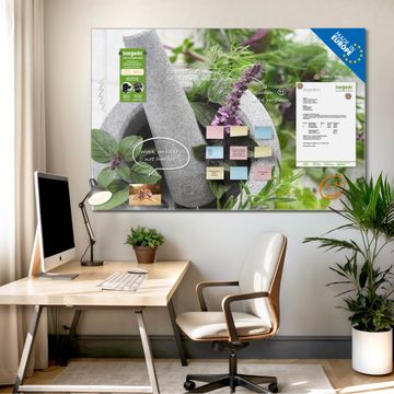Material: 4mm Sicherheitsglas mit Metallrückwand Eigenschaften: beschreibbar, magnetisch, kratzfest Maße: 75x50x0,6cm, 5,63kg schwer Motiv Nummer 10151 Kräuter Zubehör: inklusive 4 Neodym-Magnete