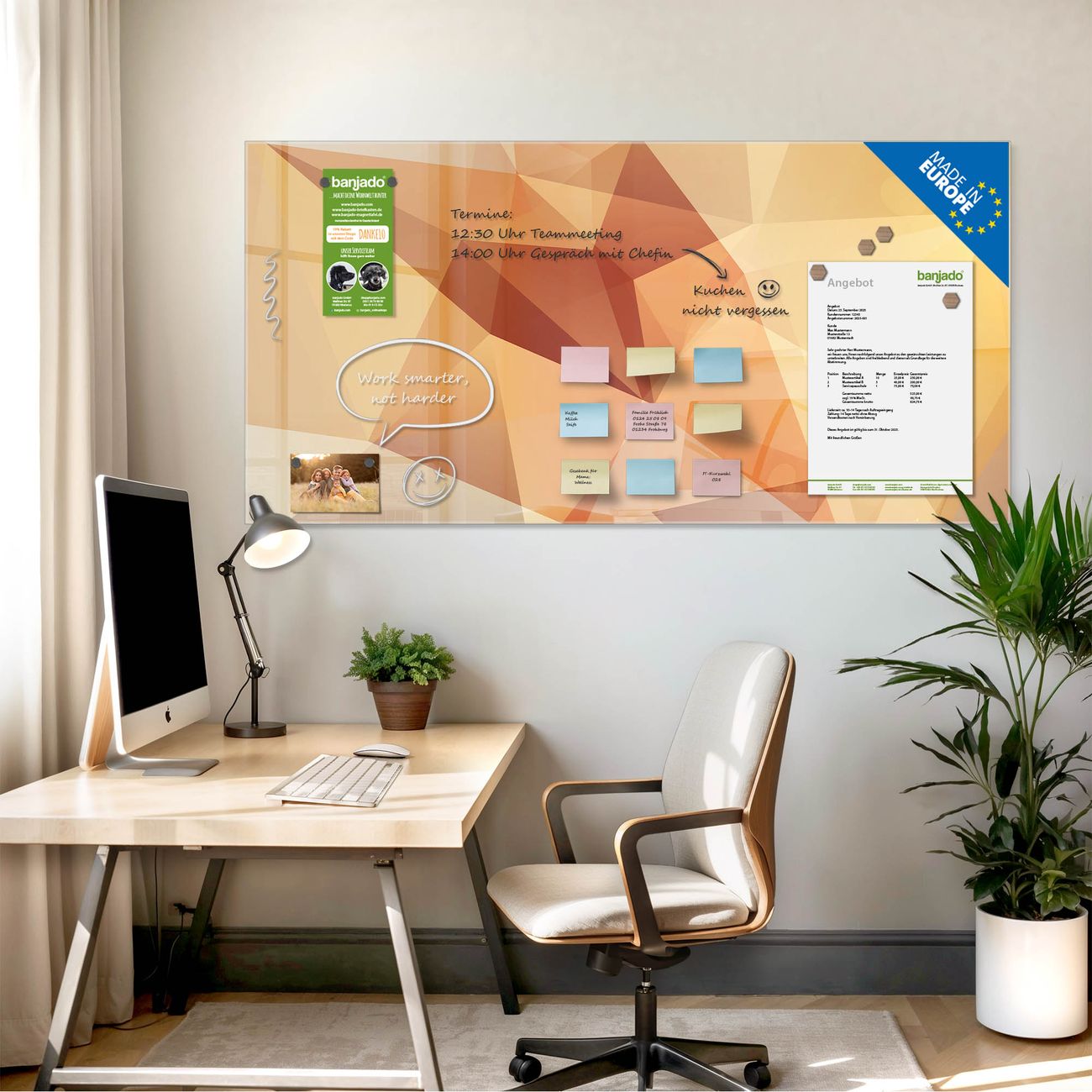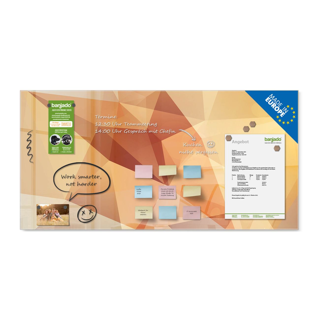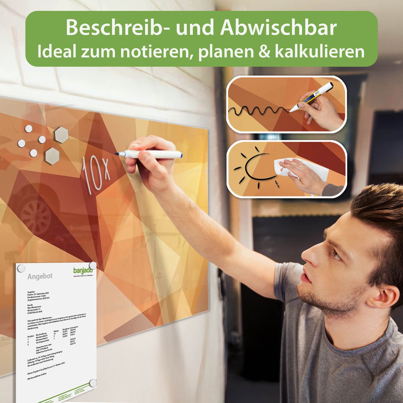 Jede Glas Magnettafel wird in unserer Werkstatt von Hand gefertigt und sorgfältig geprüft. So erhalten Sie ein echtes Qualitätsprodukt, das Funktion und Ästhetik perfekt vereint.?? Warum banjado?