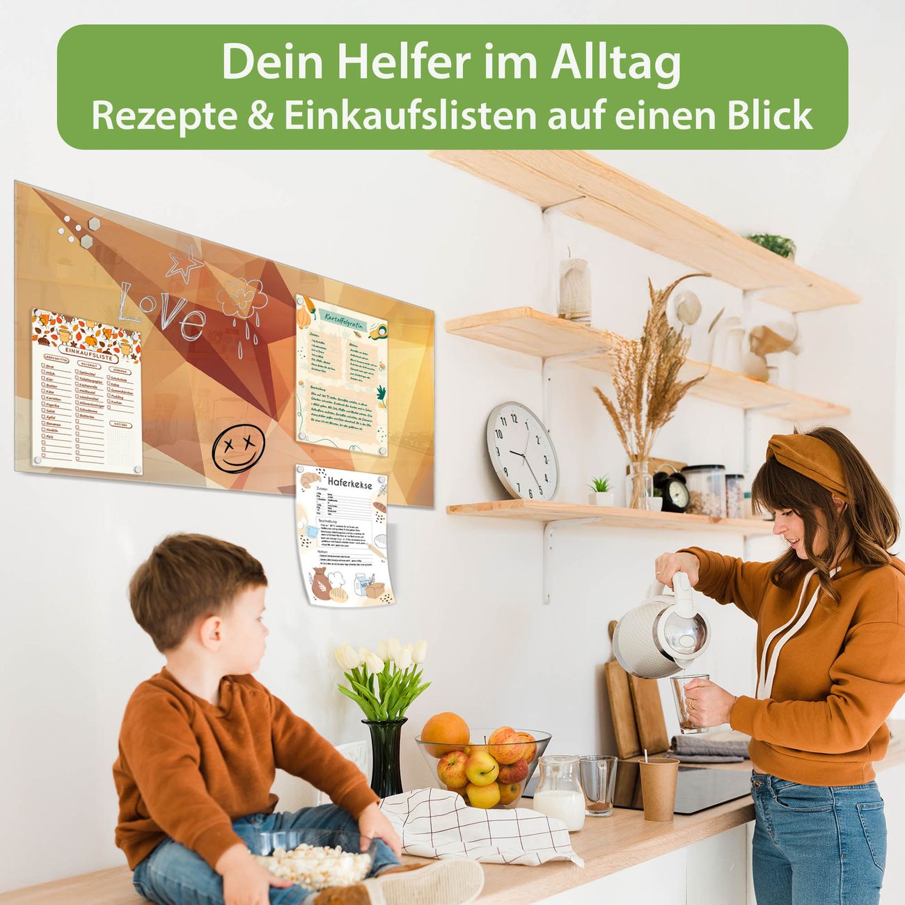 Auf der glatten Glasoberfläche lassen sich Termine, Rezepte oder Notizen ganz einfach mit Kreidestiften festhalten und rückstandslos entfernen. Starke Neodym-Magnete halten Ihre wichtigsten Erinnerungen sicher an Ort und Stelle. So entsteht Ihre ganz persönliche Ideenwand - jeden Tag neu.