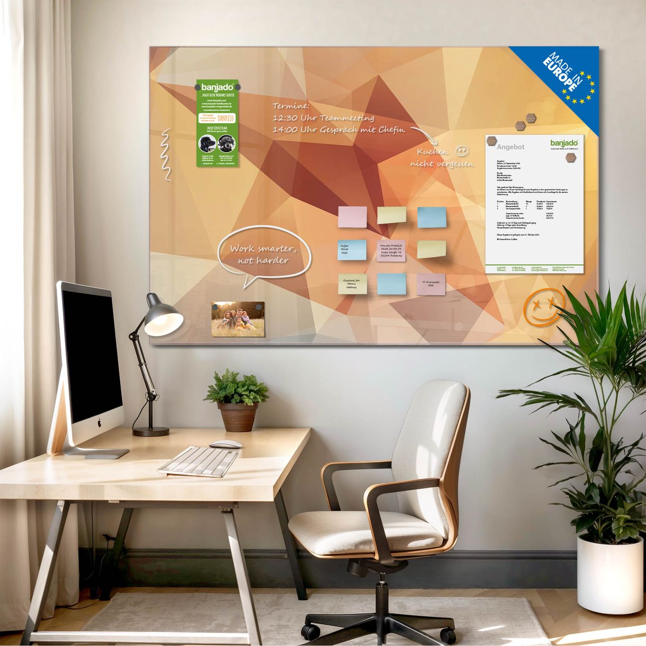 Jede Glas Magnettafel wird in unserer Werkstatt von Hand gefertigt und sorgfältig geprüft. So erhalten Sie ein echtes Qualitätsprodukt, das Funktion und Ästhetik perfekt vereint.?? Warum banjado?