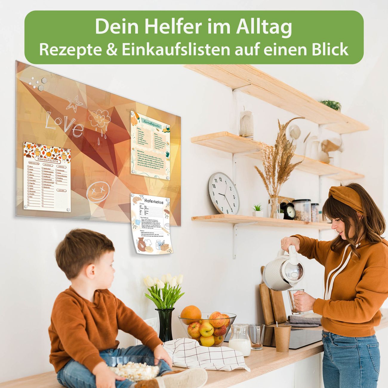Auf der glatten Glasoberfläche lassen sich Termine, Rezepte oder Notizen ganz einfach mit Kreidestiften festhalten und rückstandslos entfernen. Starke Neodym-Magnete halten Ihre wichtigsten Erinnerungen sicher an Ort und Stelle. So entsteht Ihre ganz persönliche Ideenwand - jeden Tag neu.